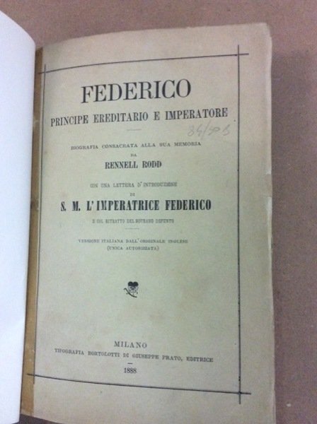 FEDERICO PRINCIPE EREDITARIO E IMPERATORE. - Biografia consacrata alla sua memoria da Rennell Rodd con una lettera di introduzione di S. M. l'Imperatrice Federico e col ritratto del sovrano defunto.