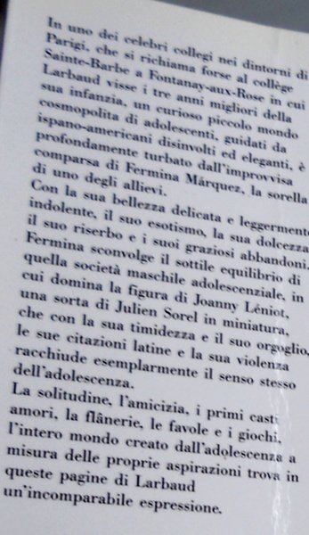 La solitudine, l’amicizia, i primi casti amori, i palpiti dei sensi e del cuore, l’intero mondo dell’adolescenza trova in queste pagine di Larbaud una delle sue espressioni letterarie più autentiche.