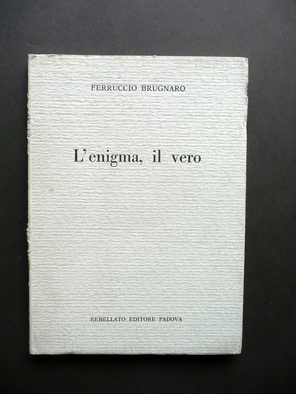 Ferruccio Brugnaro, L'enigma, il vero Rebellato Editore, Padova 1965; cm 17x12; pp. 40; brossura ed. con bandelle. Antiporta con nome del precedente proprietario annotato a penna blu. Condizioni di conservazione Esemplare ben conservato con tracce d'uso, brossure con piccole lievi tracce di sporco, poche minime abrasioni al margine esterno della brossura ant. e alla cerniera ant. Interni buoni. Rara prima edizione della seconda opera del poeta operaio Ferruccio Brugnaro. SETT145.L14002 N P
