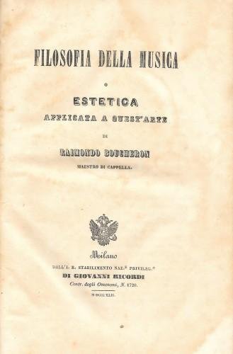 prima ediz., in 8°, pp. 158, 1, leg. coeva m/pelle con tit. in oro al ds., piatti marmor. In quest'opera l'A., (Maestro di cappella a Vigevano, Casale Monferrato e Milano), tratta del bello in musica, del carattere degli strumenti musicali, delle voci, dei toni, dei tipi di canto. Lievi aloni e lievi sfregamenti alla leg. ma buon esemplare. 424/34