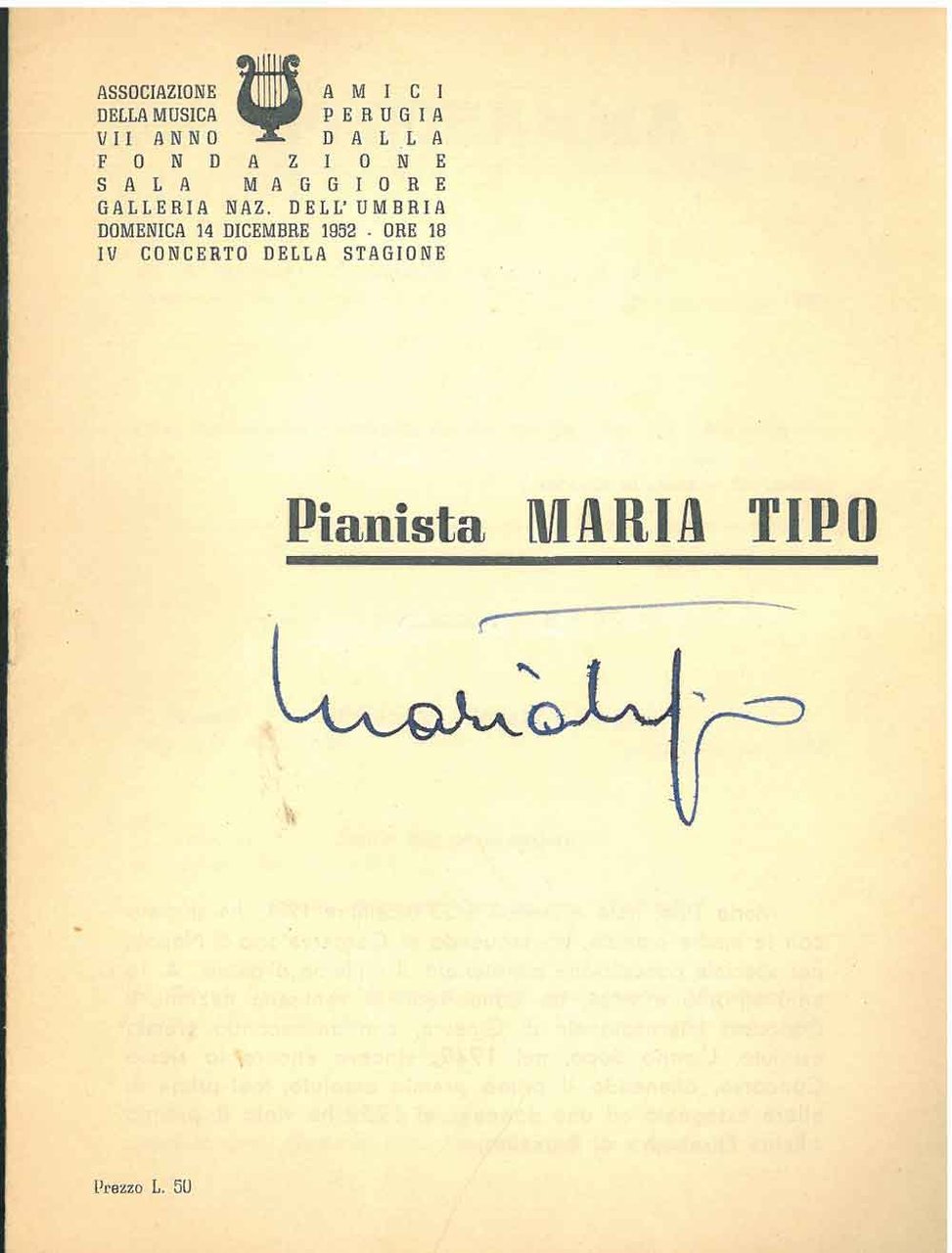 Firma autografa della celebre pianista alla copertina del programma di sala del concerto 14 dicembre 1952 per l'Associazione Amici della Musica di Perugia