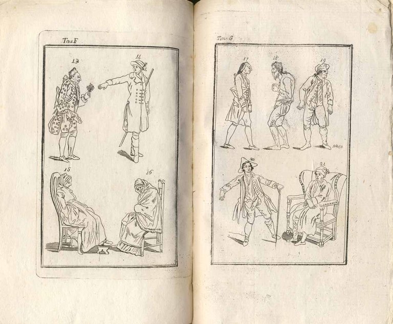 In-16 gr. (mm. 190x116), 2 volumi in 1, piena pergamena coeva (picc. spacco alla cerniera esterna), pp. 189,(3); 203,(5); molto ben illustr. da compless. 15 tavole inc. in rame fuori testo, ciasc. con 4 o 5 figure fisiognomiche (tutte descritte). Vi si tratta: Dellesteriore delluomo e delle di lui abitudini - Degli effetti della immaginazione che hanno rapporto alla fisiologia - Espressioni fisionomiche delle passioni - Della fisiologia degli animali paragonata a quella delluomo - Fisionomie nazionali. Opera tradotta dal francese. Seconda edizione. Testo ben conservato.