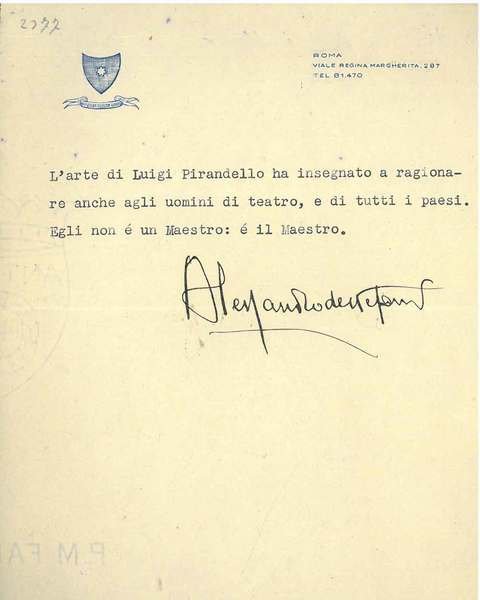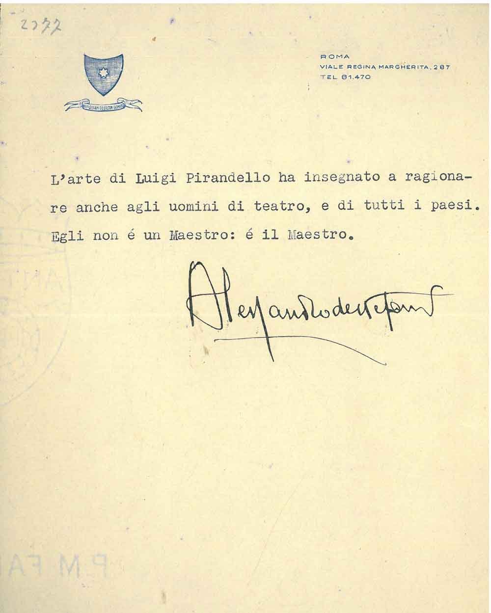 Foglio con monogramma dattiloscritto con 3 righe di considerazioni su Pirandello e firma autografa dell'Autore