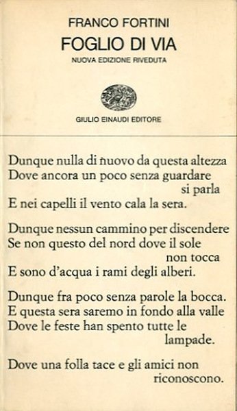 Nuova edizione riveduta con nota dell'autore. 70 p. ; 18 x 11 cm. Collezione di poesia. «Foglio di via» usciva da Einaudi nel 1946 settimo volume della collana «Poeti», inaugurata nel 1939 con «Le occasioni» di Montale. Era la prima raccolta poetica di Fortini. Ristampata con ampliamenti nel 1967 all'interno della «bianca», rimane la testimonianza del primo Fortini: un poeta che prova le forme dell'intreccio tra autobiografia e grandi classici (quasi l'ideale di una lingua morta) per fissare e lasciar decantare una realtà scissa e violenta. Poeta giovane ma già maturo, il Fortini di questi versi ha già perfettamente il senso della poesia come strumento di impegno morale e di approssimazione alla profezia. E in pieno l'energia e la ricchezza espressiva del Fortini maturo. . Brossura editoriale, coperta in cartoncino flessibile plastificato opaco. Codice libreria 2955.