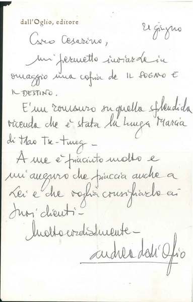 Foglio intestato: "Dall'Oglio Editore", datato "21 giugno"