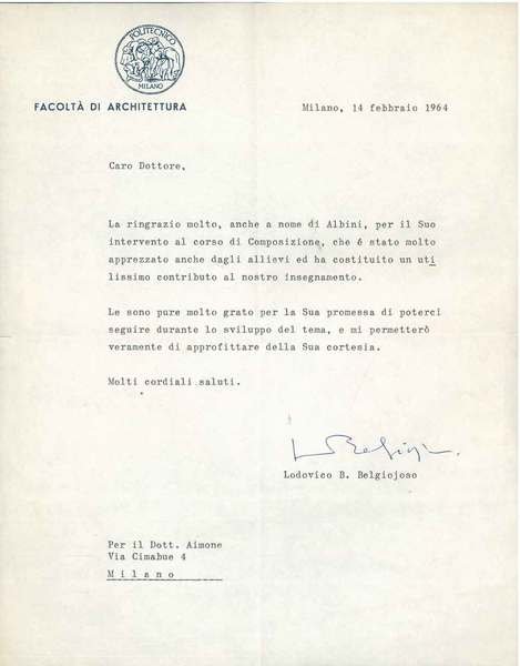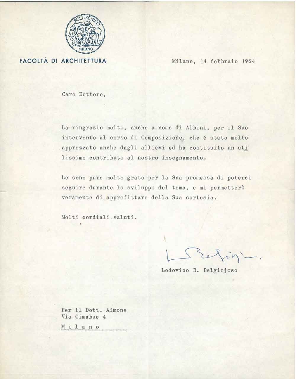Foglio intestato: "Politecnico di Milano, Facoltà di architettura" e datato: "Milano, 14 febbraio 1964"
