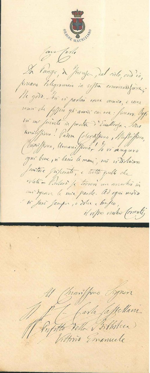 Foglio piegato con stemma policromo: "Ordine Mauriziano" e busta allegata