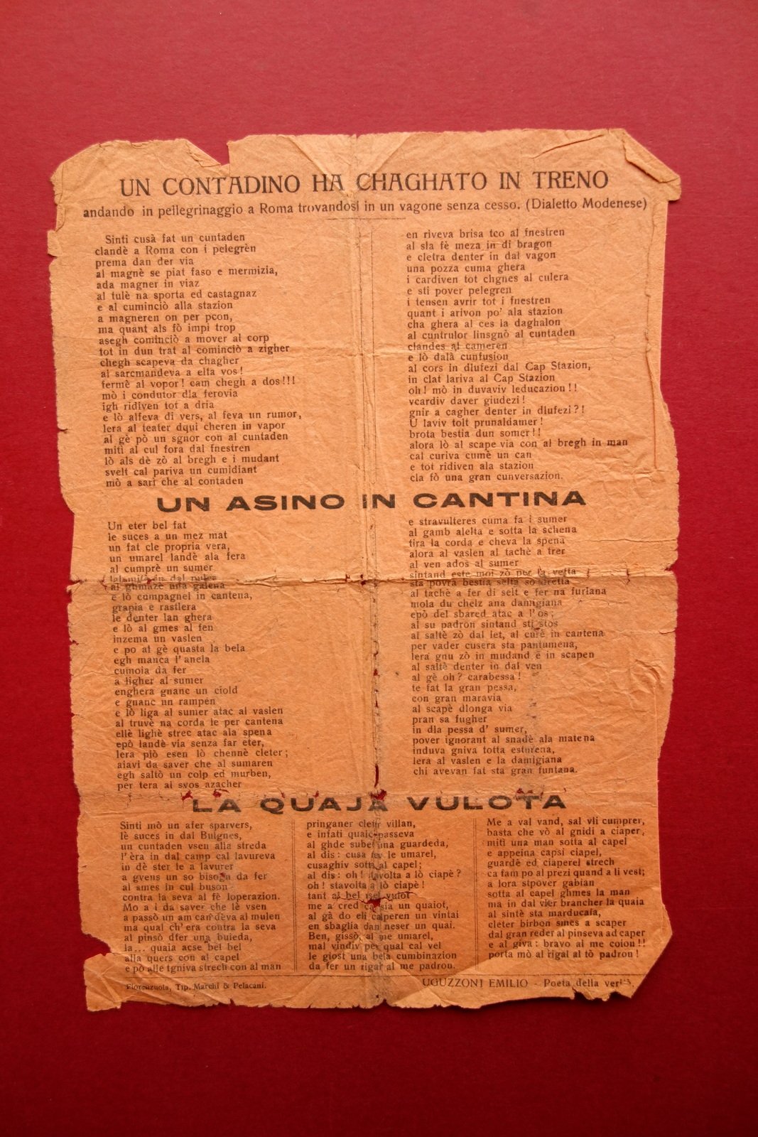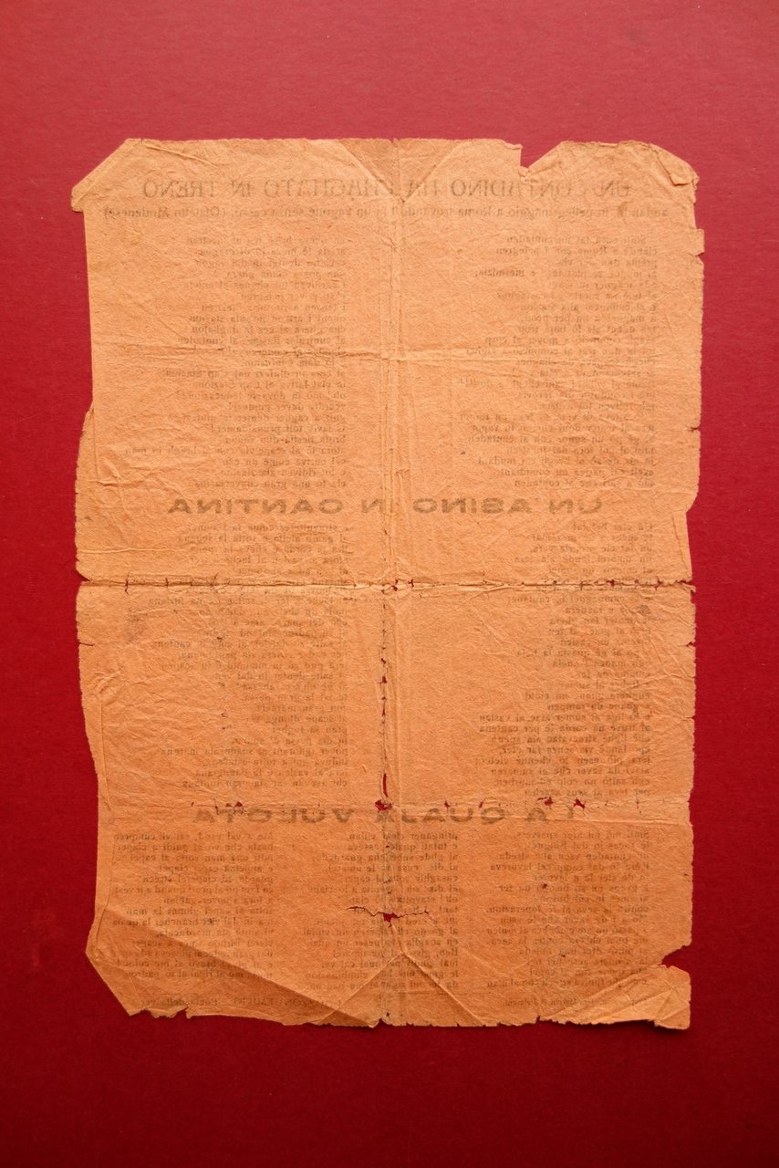 Foglio volante, Un contadino ha chagato in treno andando in pellegrinaggio a Roma trovadosi in un vagone senza cesso (Dialetto Modenese)" *** "Un asino in cantina" *** "La quaja vulota" tre poesie golardiche di Emilio Uguzzoni, definitosi "poeta della verità" Tip. Marchi e Pelacani, Fiorenzuola, s. d. ma anni '20 del Novecento; foglio volante a stampa su carta velina arancio; testi su due colonne. Retro bianco. Cm 24,5x17. Condizioni di conservazione Esemplare in condizioni discrete, delicato, con tracce di pieghe di conservazione; alcuni piccoli / minimi strappetti ai margini e in corrispondenza delle pieghe; poche minime mancanze e marginali pieghette. Per maggiori dettagli vedi foto. Tre poesie in dialetto modenese del "poeta della verità" Emilio Uguzzoni, tutte molto goliardiche. Unico. Delicato. SC03.D17024 N "