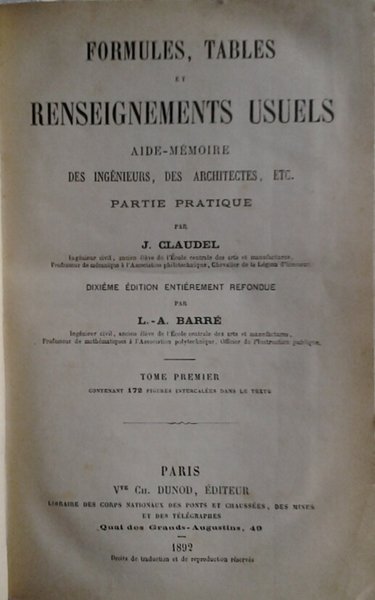 FORMULES, TABLES ET RENSEIGNEMENTS USUELS. - Aide-memoire des ingenieurs, des architectes, etc. Partie pratique.