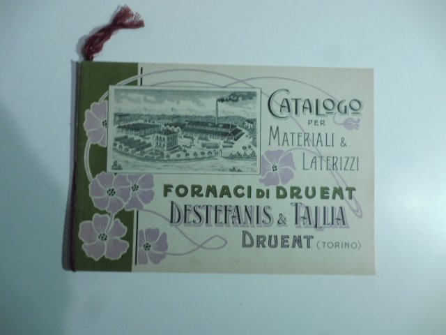 In 24 (cm 20 x 14), pp. (26). Brossura editoriale con cordoncino al dorso con vedutina dello stabilimento al piatto anteriore ripetuta al frontespizio. Catalogo illustrato dei laterizi prodotti da questa ditta di Druento. Non datato ma ascrivibile agli anni Venti.