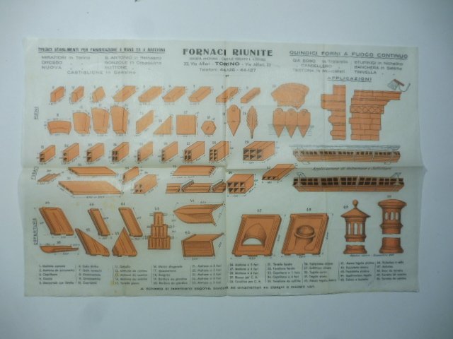 Foglio pubblicitario su carta velina (aperto misura cm 43 x 27,5) con illustrazioni. Pubblicita' delle Fornaci riunite torinesi che comprendevano tredici stabilimenti per la fabbricazione di laterizi a mano ed a macchina.