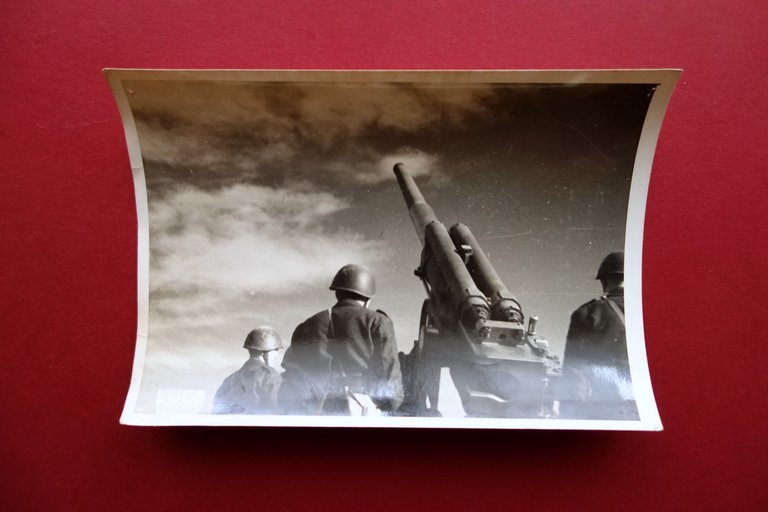 Fotografia originale, Istituto Nazionale LUCE Spedizione del 14/12/1944 Batterie contraeree dell'Aviazione Repubblicana in azione (LUCE - Massidda) Istituto LUCE, 1944; fotografia originale in b/n; al retro didascalia descrittiva dattiloscritta. Cm 13x18. Condizioni di conservazione Esemplare ben conservato, ondulato ai margini superiore e inferiore; al retro del margine inferiore traccia di precedente applicazione. Angoli sup. con minuscoli forellini per affissione. Per maggiori dettagli vedi foto. SC03.D16828 N