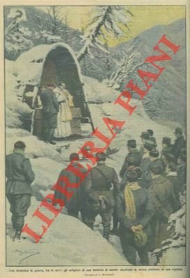 Fra le nevi gli artiglieri di una batteria di mortai ascoltano la messa celebrata in una capanna.