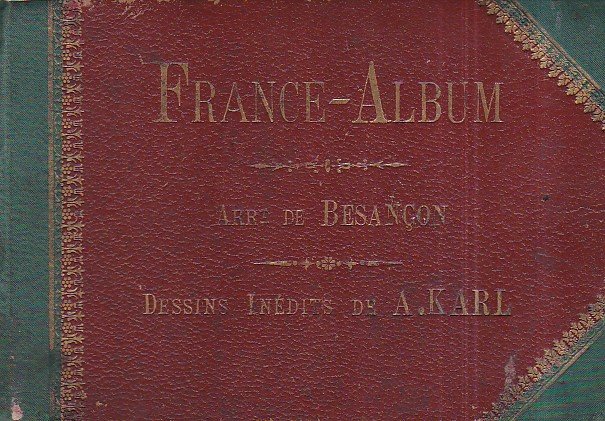 In-8° piccolo oblungo, 1 p. di testo introduttivo + 43 disegni a p. pag. di Adrien Karl 'pris sur nature' e una carta geografica. Legatura editoriale m. tela verde e angoli con titolo e decori in oro al piatto. All'interno, brossura originale illustrata in rosso. Ottimo stato. Edizione originale di questo grazioso albo di vedute di Besançon e dei suoi dintorni. France Album, n. 7.