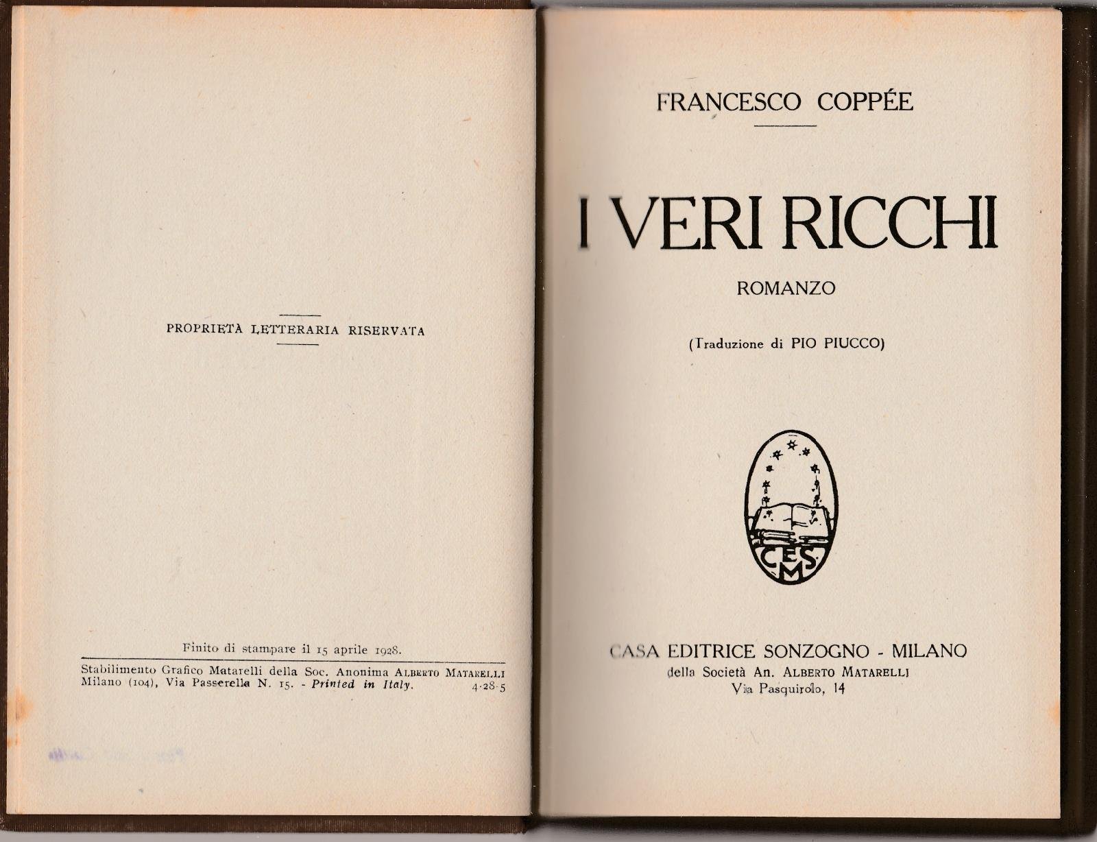 Francesco CoppeË I Veri Ricchi Romanzo Tradu. Pio Piucco, Sonzogno 1928 5977