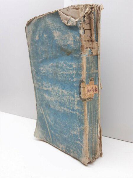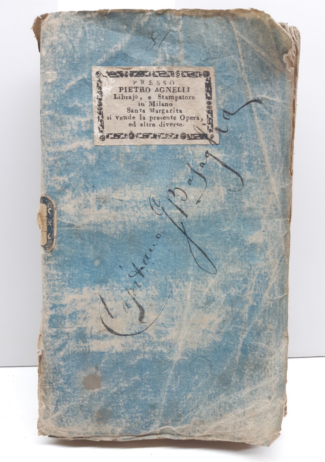 copertina morbida editoriale in pessime condizioni con etichetta del libraio e firma di possesso al piatto anteriore pieghe e piccoli strappi ai margini dei piatti, uno strappo di cm 3,5 al margine superiore e uno strappo di cm 6 al margine inferiore del dorso, dorso con traccia di etichetta ed etichetta di catalogazione, tagli irregolari bruniti con sporcizie, impolverati quelli superiori, prima pagina bianca incollata alla seconda di copertina, legatura allentata, interno in condizioni accettabili, pieghe agli angoli delle pagine, fioriture alle pagine interne che non vanno a disturbare la lettura, a pagina 23 restauro eseguito in maniera sommaria, una piccola mancanza al margine esterno di pagina 38 che non va ad interessare il testo, alcune pagine con margine esterno leggermente inferiore alle altre, alcune pagine a fogli chiusi, a pagina 208 segno di matita colorata al margine esterno, a pagina 311 mancanza di una parte del margine esterno senza interessamento del testo, numero pagine 332 + indice, dimensioni cm 19 x 11,5 x 3,5