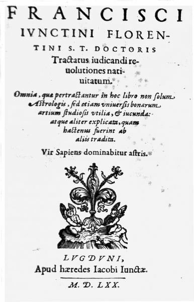 FRANCISCI IUNCTINI FLORENTINI S.T. DOCTORIS TRACTATUS IUDICANDI REVOLUTIONES NATIVITATUM. - Omnia, quae pertractantur in hoc libro non solum Astrologis, sed etiam universis bonarum artium studiosis utilia, & iucunda: atque aliter explicata, quam hactenus fuerint ab aliis tradita.