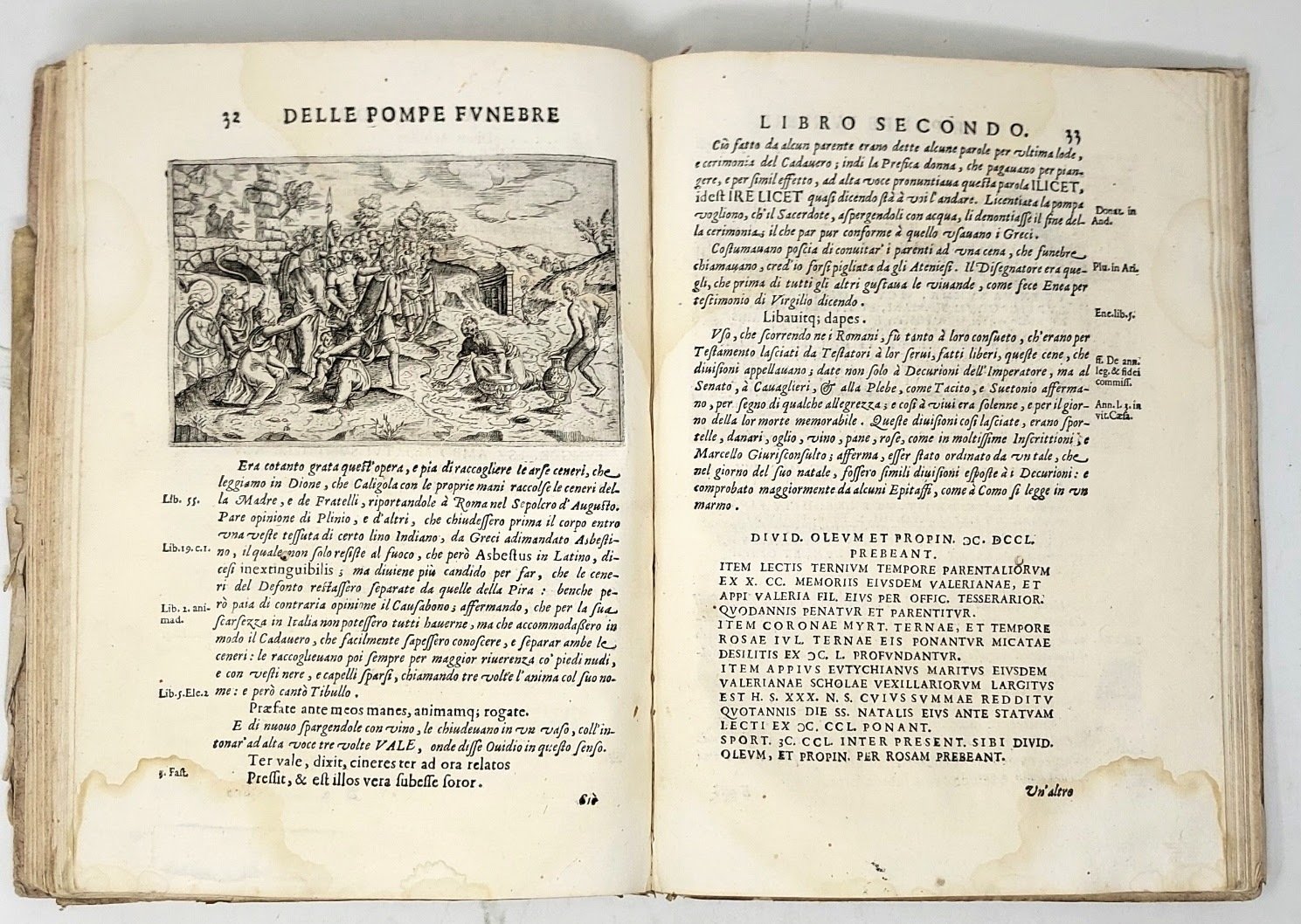 in-4, pp. (12, con tit., dedica e indice), 97 (iniziando da 5), (1); Dedica dello stampatore a Claudio Bassetti, testatine, finalini e capilettera xilografati. Precedono alcuni componimenti poetici in latino ed italiano di vari autori in onore dell'opera. Bellissimo frontespizio a motivo architettonico, 8 incisioni su rame piccole e 23 a mezza pag., copiate da quelle del Porro inserite nell'opera del Porcacchi ''Funerali antichi'' ed incise qui in controparte. Prima edizione di quest'opera interessante che, come avverte l'autore nella breve prefazione ai lettori, vuole perfezionare il celebre trattato del Porcacchi «che conoscevasi mancare in molte squisitezze, e curiosità, che bisognavano alla piena intelligenza dell' historia». L'opera include, tra l'altro, notizie sulle usanze funerarie dell'Africa, dell'America, dell'India e di diversi paesi orientali.