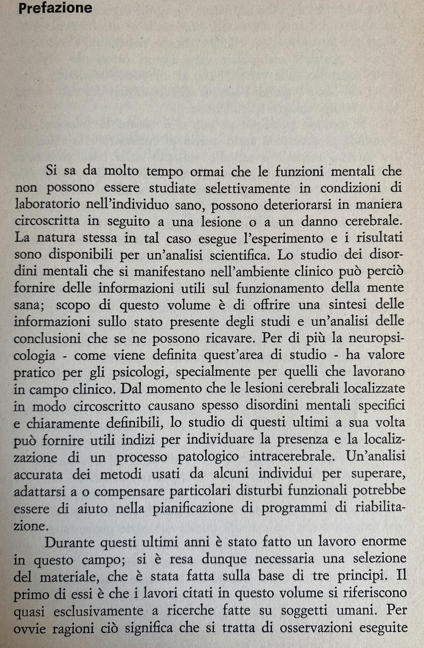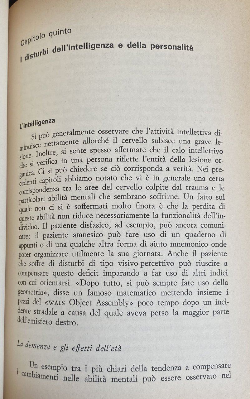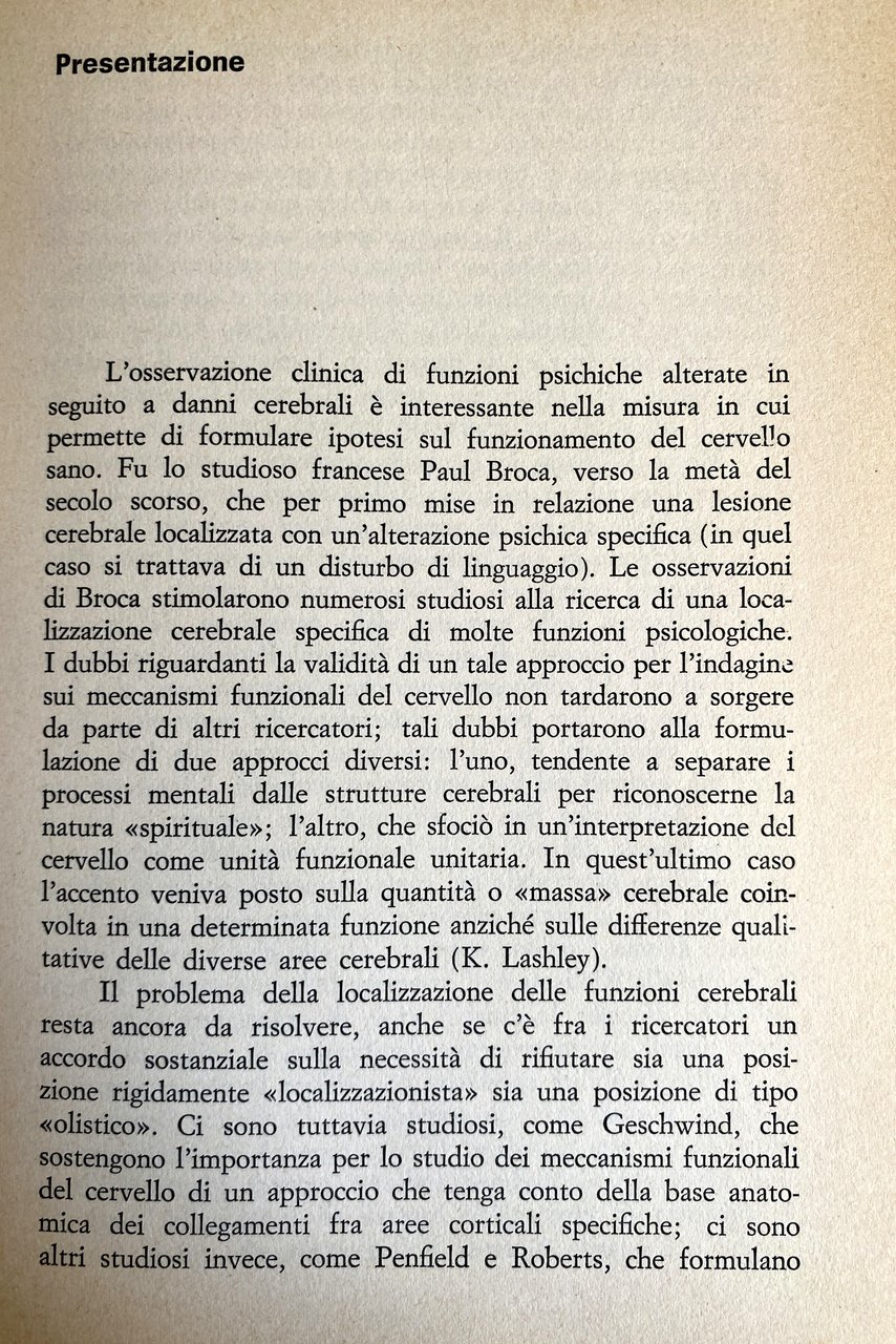 Soggetti: Cervello Funzioni mentali Studi scientifici Manuali Disordini Danni cerebrali Lesioni Malattie neurologiche cognitive Patologie Neurologia Medicina Psicologia Coscienza Affettività Relazioni Tonalità affettive Coscienza Veglia Disturbi Memoria Amnesia anterograda retrograda Percezione Agnosia visiva Immagine Corpo Difetti Acustica Abilità motorie Espressione verbale Aprassia Linguaggio Dislessia Disgrafia Intelligenza Personalità Riferimenti Bibliografia Osservazione Ricerche Clinica Uomini Esseri umani Esperimenti Animali Attività motoria Disabilità Letteratura scientifica Fonti Olistica Anatomia Fisiologia Funzionamento Trauma cranico Paul Broca K.S. Lashley Fisica Mente Meccanismi Geschwind Collegamenti Aree corticali Penfield Roberts Stimolazione elettrica Comportamento A. R. Luria Lurija Funzioni superiori Pensiero Funzioni psichiche alterate Sistemi funzionali complessi Modificazioni Alterazione Atti Sequenze Perdita Competenze Comunicazione Compensazione Adattamento Dipendenza Operazioni localizzabili Traumi cranici Sperimentale Umore Inconscio Invecchiamento Paralisi Anosognosia Afasia Eccitazione Emisferi Comprensione Corteccia Segnali corticali Difetti Paziente Demente Demenza Difficoltà Disfasia Pazienti disfasici Elettrodi Errori Lobi frontali funzioni Sindrome di Gerstmann Geschwind Gloning Compromissione Incapacità Intellettuale Apprendimento Emisfero sinistro Leucotomia Perdita Linguistica Corpi mammillari Motore Neuropsicologia Normale Oggetti Lobo parietale Prestazione Fantasma Prefrontale Psichiatria Psicologico Lettura Scrittura Riconoscimento Riconoscere Risposta Destro Rochford Sensoriale Stimoli Sintomi Temporale Test Ventricolo verbale Warrington Ricerca Parole Zangwill Freud Goldstein Mayer Gross Lewin Petrie Rochford Russel Semmes Shankweiler Simmel Thorndike Warrington Whitty Weinstein Zangwill G. Benedetti J.C. Eccles Benton Konorski Mammiferi Mann-Whitney Ribot Eventi regressione Ricordi piacevoli Passato Vecchiaia Chemioterapia Depressione Impulsi nervosi Ipotalamo Fame Sete Controllo Aggressività Violenza Immaginazione Vigilanza Virus Encefalite Pierre Marie Sordità Bambini Vignolo Incidenti Kimura Disorientamento spaziale Critchley Colori Alcool Nomi Droghe Errori Prontezza Riflessi Agrammatismo Propriocezione Propriocettivi Tattili Vor Gestalt Emozioni Esercizi Recupero Ictus Età Deficit Terapia Brain Mental functions Scientific studies Manuals Disorders Brain damage Injuries Cognitive neurological diseases Pathologies Neurology Medicine Psychology Consciousness Affectivity Relationships Affective tones Consciousness Waking Disorders Memory Anterograde retrograde Perception Visual Body image Defects Acoustics Motor skills Verbal expression Apraxia Language Dyslexia Dysgraphia Intelligence Personality References Bibliography Observation Research Clinic Men Human beings Experiments Animals Motor activity Disability Scientific literature Sources Holistic Anatomy Physiology Functioning Head trauma Physics Mind Mechanisms Connections Cortical areas Electrical stimulation Behavior Higher functions Thinking Altered psychic functions Complex functional systems Modifications Alteration Acts Sequences Loss Skills Communication Compensation Adaptation Dependence Localized operations Head injuries Experimental Mood Unconscious Aging Paralysis Aphasia Excitation Hemispheres Comprehension Cortex Cortical signals Defects Patient Demented Dementia Difficulties Dysphasia Dysphasic Electrodes Errors Frontal lobes functions Syndrome Impairment Intellectual disability Learning Left hemisphere Leucotomy Loss Linguistics Mammillary bodies Motor Neuropsychology Normal Objects Lobe parietal Performance Ghost Prefrontal Psychiatry Psychological Reading Writing Recognition Recognize Response Right Sensory Stimuli Symptoms Temporal Verbal Ventricle Word Search Mammals Events Regression Pleasant Memories Past Chemotherapy Depression Nerve Impulses Hypothalamus Hunger Thirst Control Aggression Violence Imagination Alertness Encephalitis Deafness Children Accidents Spatial Disorientation Colors Alcohol Names Drugs Errors Readiness Reflexes Agrammatism Proprioception Proprioceptive Tactile Emotions Stroke Recovery Exercises Age Therapy
