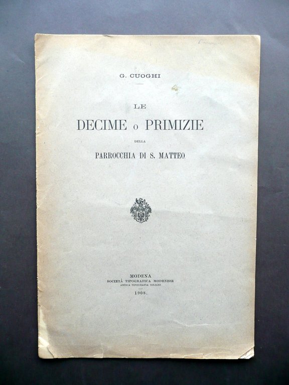 G. Cuoghi, Le Decime o Primizie della Parrocchia di S. Matteo Società Tipografica Modenese (Antica Tipografia Soliani), cm 31x21, pp. 16; brossura ed. Condizioni di conservazione Esemplare complessivamente ben conservato con tracce d'uso; margini angoli e dorso delle brossure lievemente ingialliti, con poche circoscritte mancanze e strappetti (alla parte inf. del dorso è presente uno strappetto di vari cm); interni buoni; angolo sup. della pima pagina con un paio di tracce di pieghette; margine est. dell'ultima pagina bianca con un minuscolo strappetto. Interessante breve indagine sui fondamenti storici e legali delle decime o primizie all'epoca elargite alla Parrocchia di S. Matteo in Villanova (Modena), nata a partire da una controversia relativa a un mancato versamento delle stesse, avvenuta nell'anno 1908. SC03.D11728 N