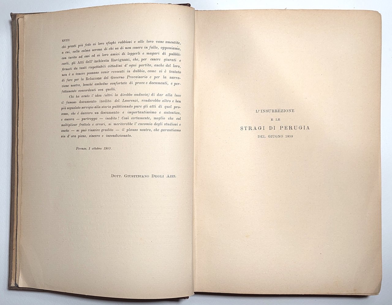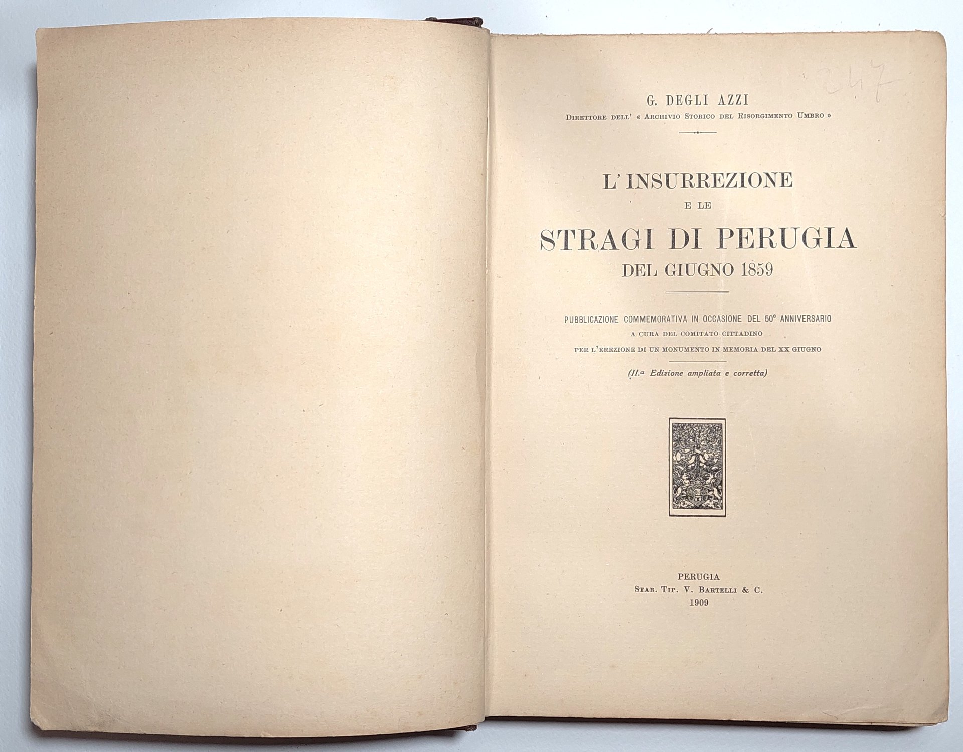 G. degli Azzi L'insurrezione e le stragi di Perugia del giugno 1859 Bartelli 1909 2° ed