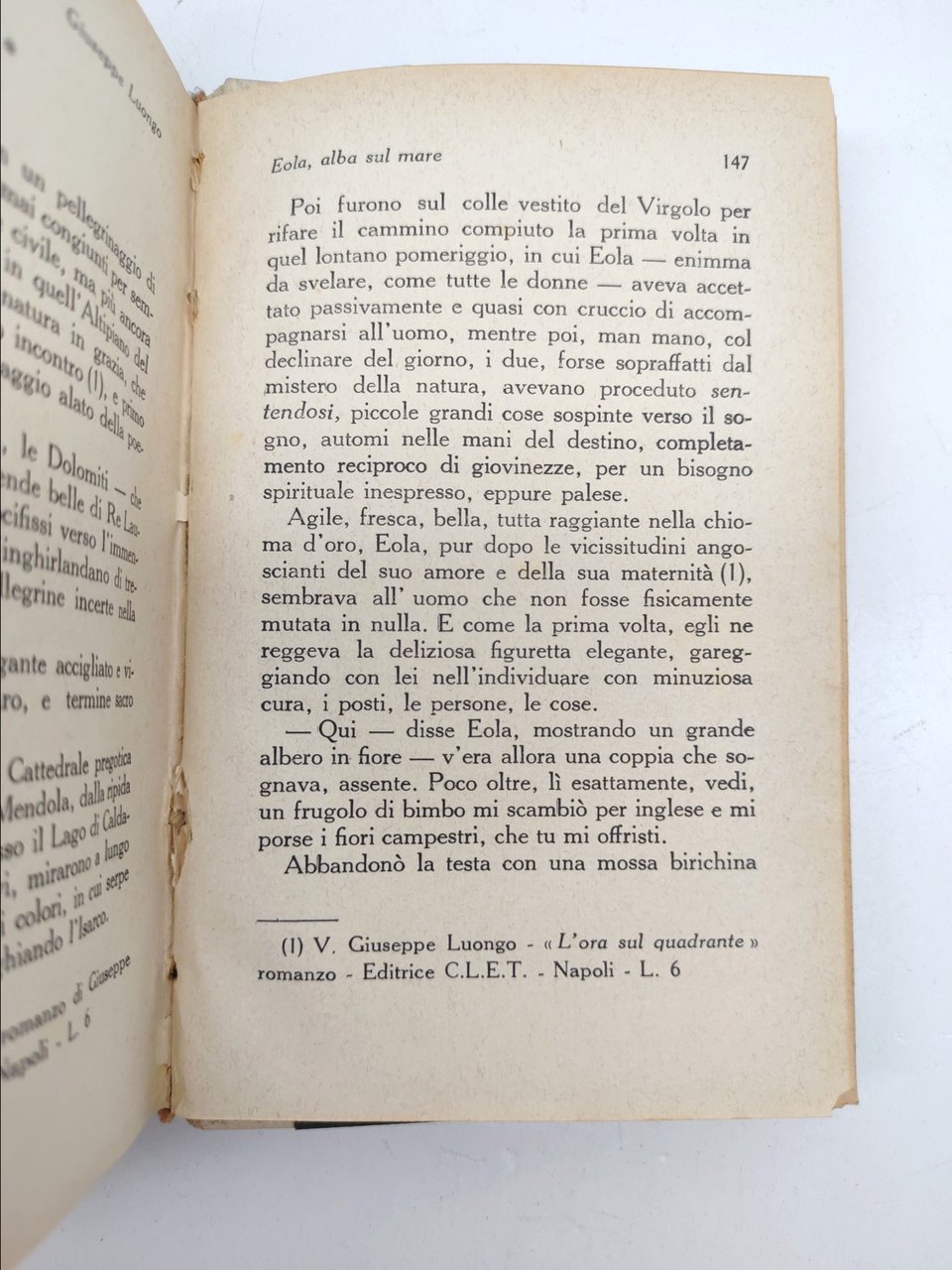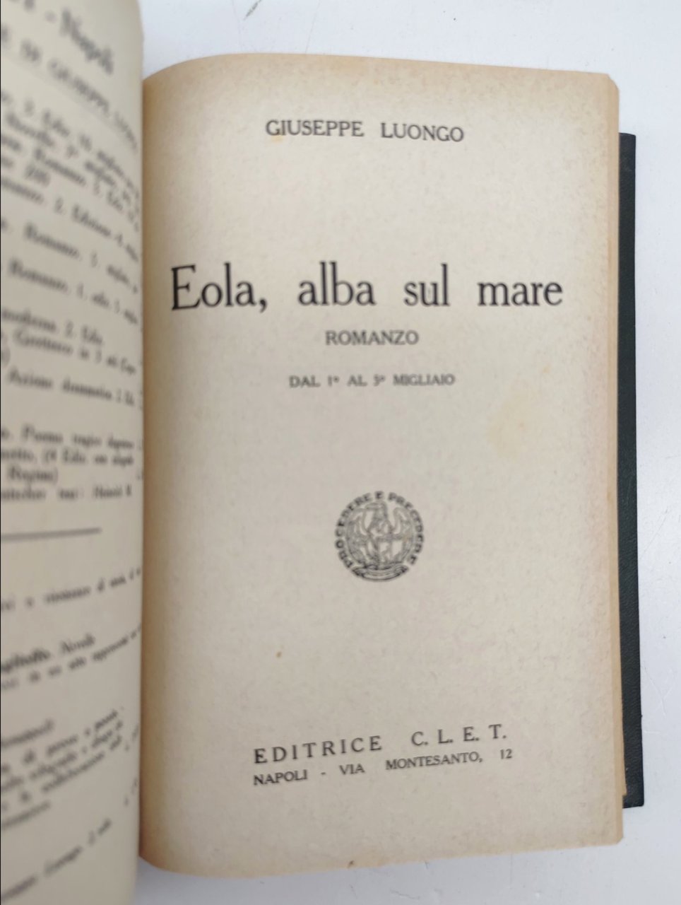 Eola alba sul mare romanzo 1935 dal 1° al 5° migliaio, numero pagine 150, una rottura alla cerniera da pagina 147 a pagina 150, dimensione del volume cm 19 * 13 * 4
