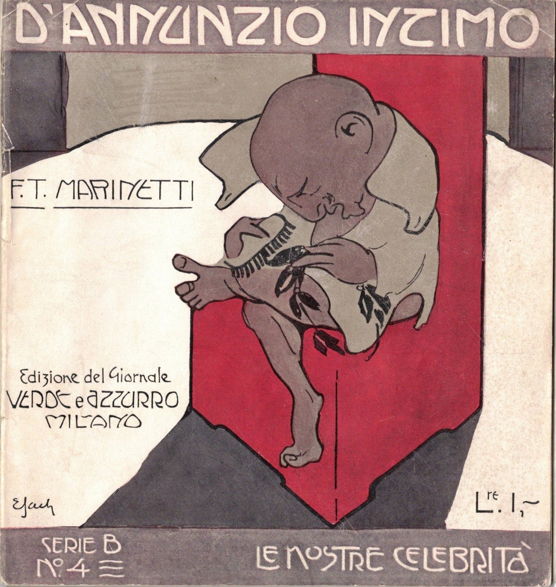 In-16 gr., brossura editoriale a colori con disegno di Enrico Sacchetti (titolo stampato in italiano DAnnunzio intimo), pp. 29,(3). "Prima edizione", dedicata A son Altesse Sérénissime MADAME LA PRINCESSE DE MONACO. Cfr. Cammarota, Marinetti, 4: Saggio, testo in francese, già edito in La Vogue,IV, Paris, 15 giugno 1900; poi in Verde e Azzurro,I, n. 1, Milano, 19 aprile 1903; poi in questedizione per gli abbonati del giornale. Cfr. anche Salaris, p. 44. Ben conservato.