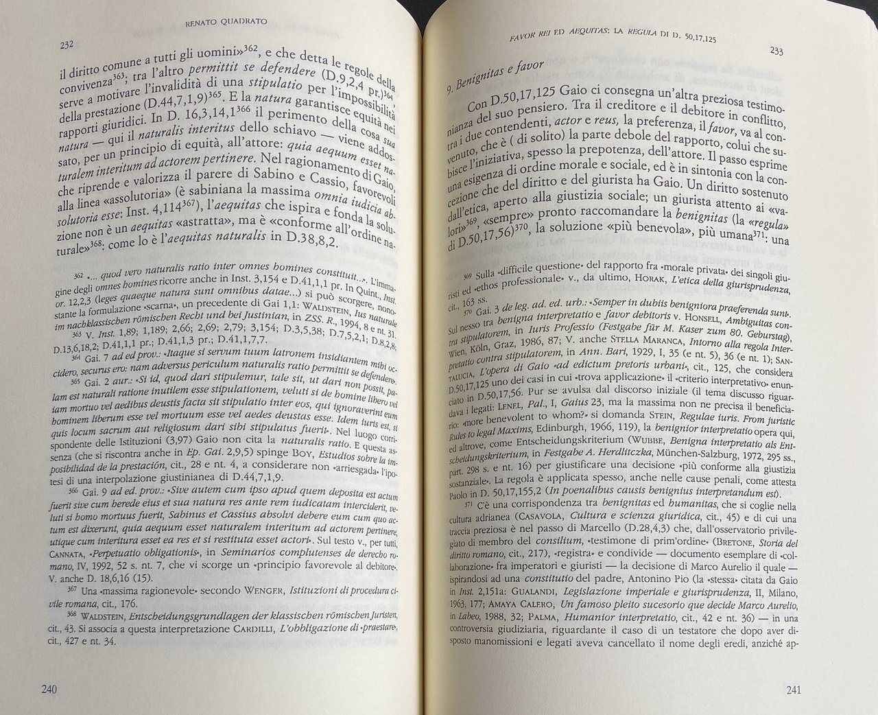 Sommario: La persona in Gaio. Il problema dello schiavo. "Interpretatio" e "iuris processus". 'Hominis appellatio' e gerarchia dei sessi: D. 50,16,152 (Gai. 10 ad L. Iul et Pap.). "Iuris conditor". L'abuso del diritto nel linguaggio romano: la regula di Gai Inst. 1.53. Infirmitas sexus e levitas animi: il sesso "debole" nel linguaggio dei giuristi romani. Favor rei ed aequitas: la regula di D. 50,17,125. 'Vivere' in Gai. 2 ad leg. XII tab. D. 50,16,234,2. Province e provinciali: il cosmopolitismo di Gaio. Gaio e la legum interpretatio. Gaio cristiano?. Hominum gratia.
