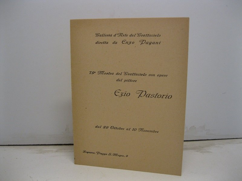 Pieghevole composto da 4 facciate (cm 11 x 14,6). Invito alla mostra delle opere di Ezio Pastorio, a Legnano, organizzata dalla galleria del Grattacielo. Pastorio, pittore cremonese della generazione di mezzo, sembra prolungare coi suoi quadri di paesaggio e di 'natura morta' la tradizione prettamente lombarda dei Tosi e, prima ancora, dei Gola e Ranzoni.