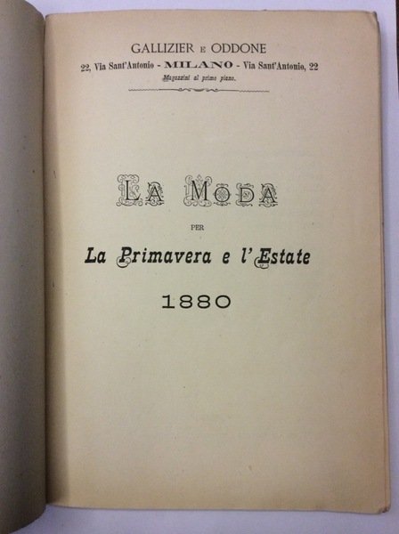 In-8 p. (mm. 218x150), brossura orig. blu (con aloni), pp. 38, con una speciale raccolta di 22 modelli, stampati su un grande foglio di cm. 62 x 84, più e più volte ripiegato, ad illustrare cappelli, abiti-tolette da signora, da ragazzine e mantelli. In Appendice compartimento stoffe e confezioni per uomo, con l'illustrazione di 5 modelli. Questo bel catalogo è dedicato alle stoffe e ai "corredi da sposa", confezionati e non (per la cerimonia nuziale - feste, ricevimenti, visite d'etichetta, passeggio e visite intime, viaggio, casa), specialità della Casa. La Gallizier & Oddone, nel 1880, si trovava ancora nella vecchia sede di Via Sant'Antonio. Buon esemplare.