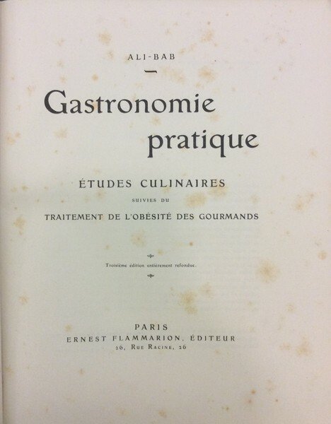 In-8 gr. (mm. 270x208), tela editoriale, titolo oro al piatto e al dorso, pp. (4),1107,(3); le prime 50 pagine sono dedicate alla storia della gastronomia in vari paesi del mondo, dove l'A. visse e lavorò a lungo nella sua qualità di ingegnere civile delle miniere; ma il contatto con le diverse cucine straniere, non poteva che suscitare in lui un grande interesse per l'arte culinaria. Ecco come introduce la sua opera: Je réunis en volume un certain nombre de recettes que je me suis efforcé de rédiger d'une façon claire et précise; j'entre, en les décrivant, dans tous les détails nécessaires; j'indique les proportions pondérales des éléments toutes les fois que je le crois utile; je m'attache, en un mot, à donner de véritables formules scientifiques qui permettent de reproduire exactement les préparations décrites, sans qu'il faille, pour les réussir, avoir de grandes connaissances culinaires..". E il volume contiene più di 5.000 dettagliate ricette, ma anche testi sugli alimenti e le bevande utilizzate. In Appendice uno studio sul Traitement de l'obésité des gourmands con delle raccomandazioni particolari per il déjeuner du matin - du midi et le diner.L'Autore, il francese Henri Babinski (1855-1931), noto come Ali-Bab, lavorò per più di 15 anni all'estero ma, a partire dall'inizio del Novecento e fino alla sua morte, visse a Parigi, dedicandosi alla scrittura dell'arte culinaria. Nel 1907 pubblicava "Gastronomie pratique", e il volume fu da lui notevolmente corretto e accresciuto in seguito, tanto che già questa terza edizione è di 1107 pagine, e diventa opera di riferimento della gastronomia francese dell'inizio del XX secolo.Cfr. Bitting Gastronomic Bibliogr., p. 23: The 5th edition augmentée et remaniée, 1928, contains 1281 pages. Con lievi fioriture interc. nel testo ma certamente un buon esemplare, con dedica autografa dell'A. Au Dr. Gatti, souvenir amical / H. Babinski.