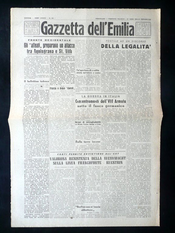 Gazzetta dell'Emilia Anno LXXXVI N.101 7 Febbraio 1945 WW2 2∞Guerra Mondiale RSI