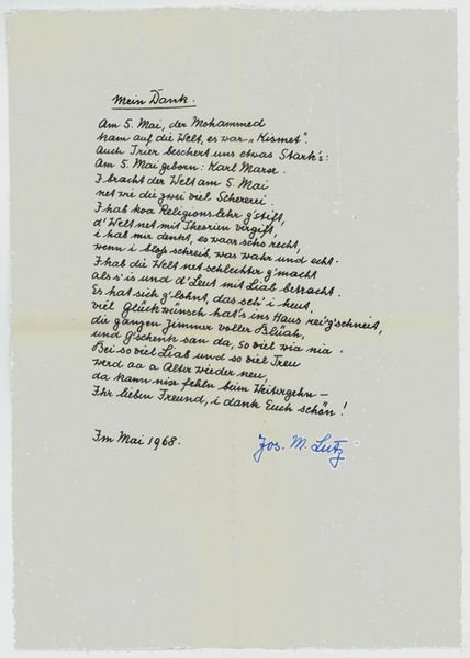 1 S. 4to. 1 S. 4to. Mit ms. Kuvert. Dankt den Gratulanten - und so auch Josef Wesely - für Glückwünsche zu seinem Geburtstag mit einem zwanzigzeiligen, in Mundart verfaßten Gedicht. - Lutz, schwer verwundet aus dem Ersten Weltkrieg zurückgekehrt, lebte seit 1921 als Schriftsteller in München und schrieb Erzählungen und Lyrik sowie Essays zu Themen der bayerischen Literatur- und Kulturgeschichte; 1949 schrieb er die Neufassung der Bayernhymne. Vgl. Kosch X, 150.