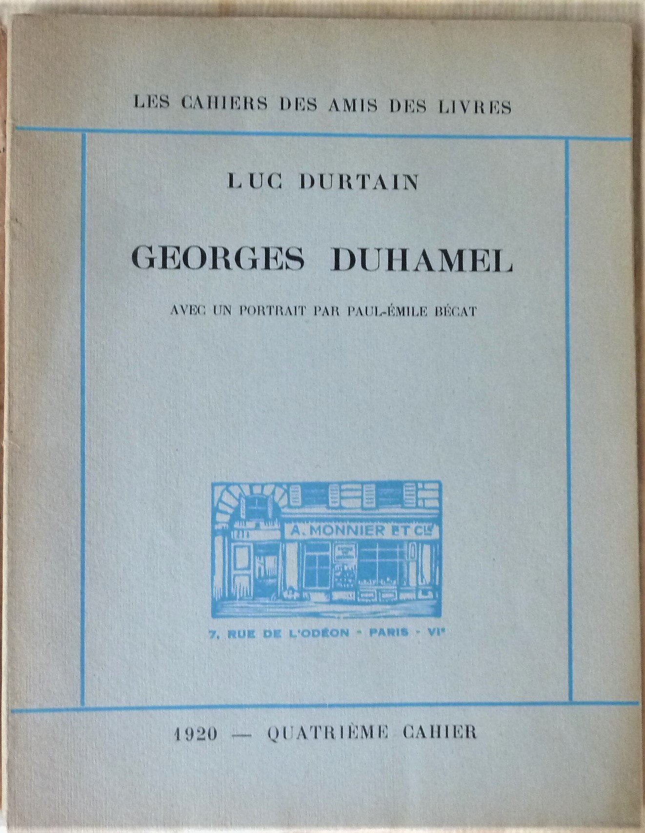 Georges Duhamel. Avec un portrait par Paul-Emile Bécat. Les Cahiers des Amis du Livre; Quatrième Cahier; Librairie A. Monnier.