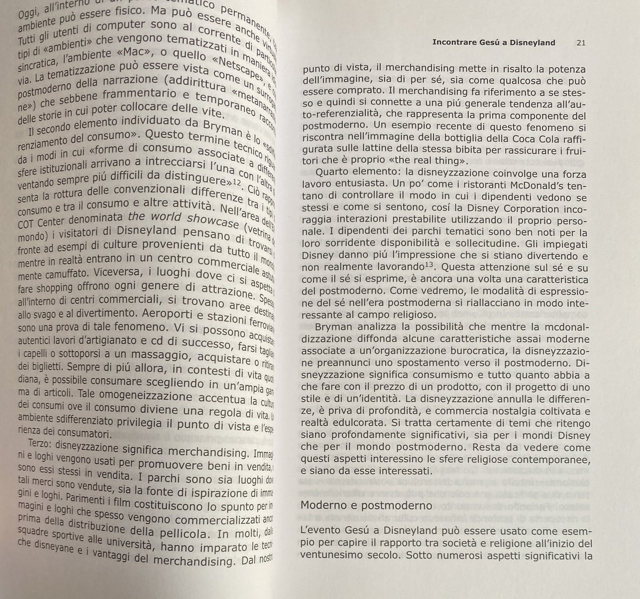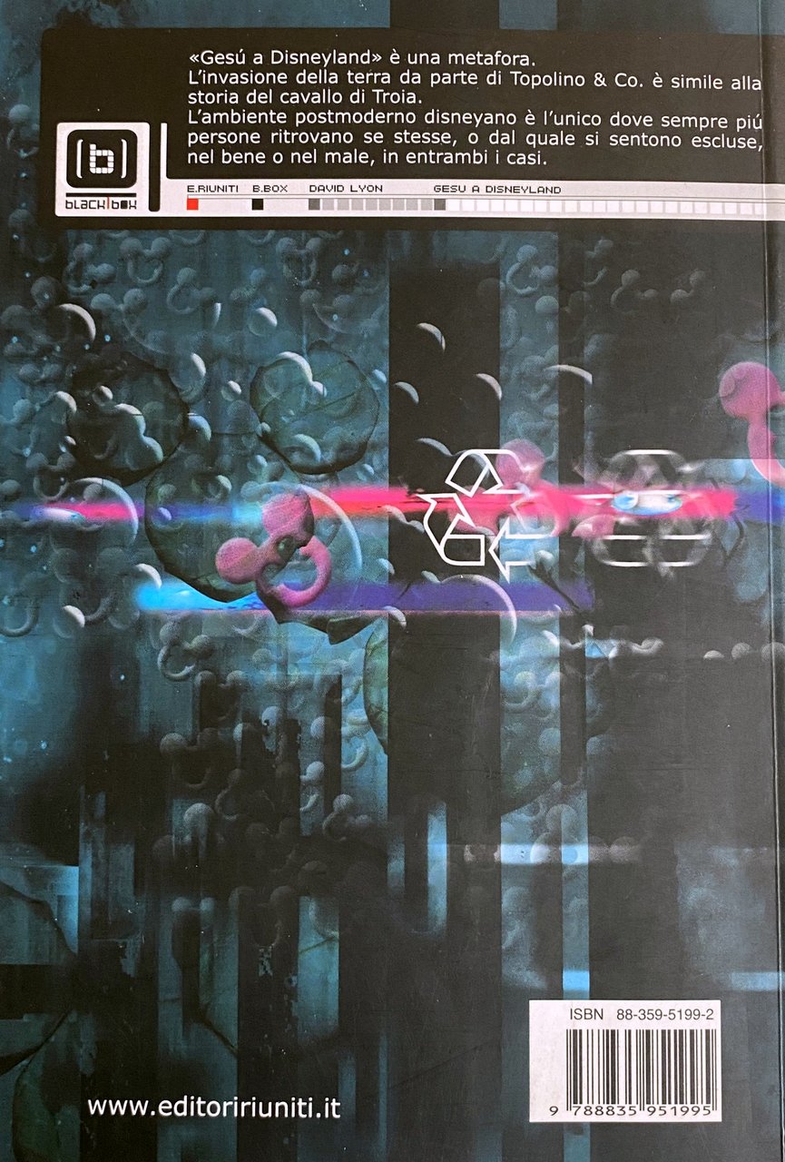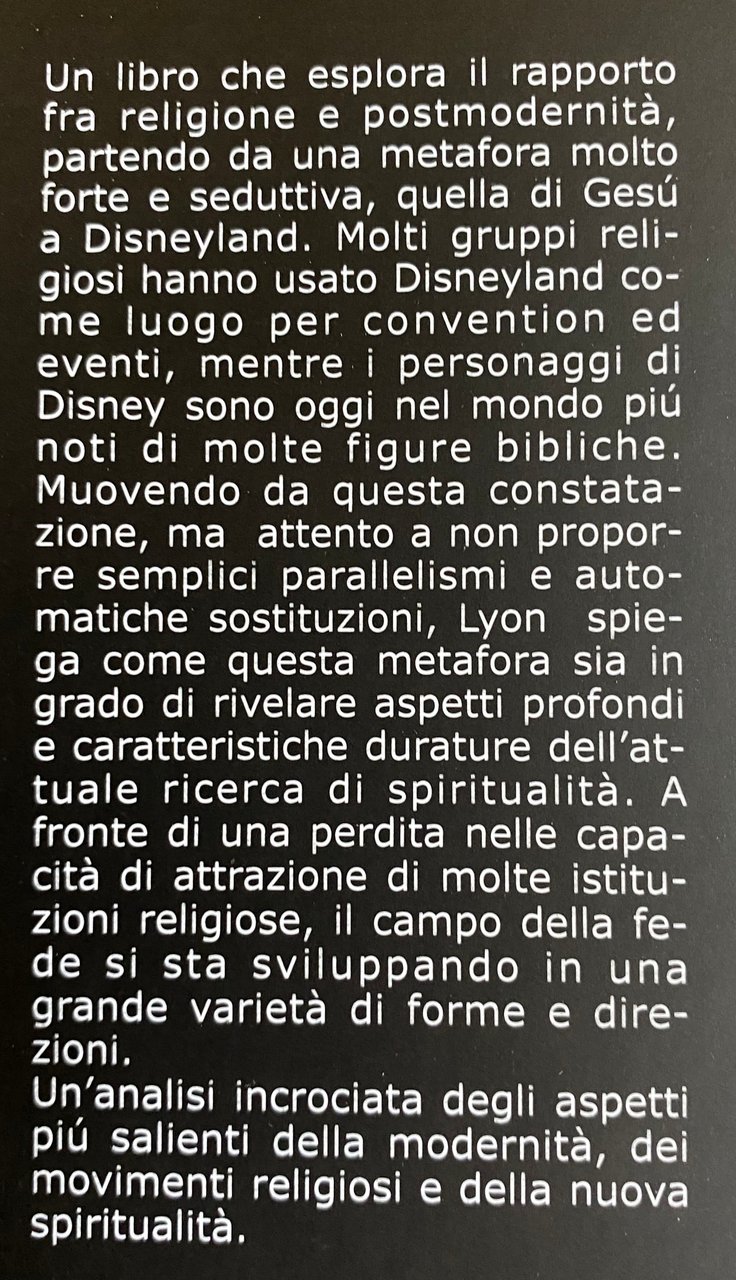 Un libro che esplora il rapporto fra religione e postmodernità, partendo da una metafora molto forte e seduttiva, quella di Gesù a Disneyland. Molti gruppi religiosi hanno usato Disneyland come luogo per convention ed eventi, mentre i personaggi di Disney sono oggi nel mondo più noti di molte figure bibliche. Muovendo da questa constatazione, ma attento a non proporre semplici parallelismi e automatiche sostituzioni, Lyon spiega come questa metafora sia in grado di rivelare aspetti profondi e caratteristiche durature dell'attuale ricerca di spiritualità. A fronte di una perdita nelle capacità di attrazione di molte istituzioni religiose, il campo della fede si sta sviluppando in una grande varietà di forme e direzioni. Un'analisi incrociata degli aspetti più salienti della modernità, dei movimenti religiosi e della nuova spiritualità. Gesù a Disneyland è una metafora. L'invasione della terra da parte di Topolino & Co. è simile alla storia del cavallo di Troia. L'ambiente postmoderno disneyano è l'unico dove sempre più persone ritrovano se stesse, o dal quale si sentono escluse, nel bene o nel male, in entrambi i casi.