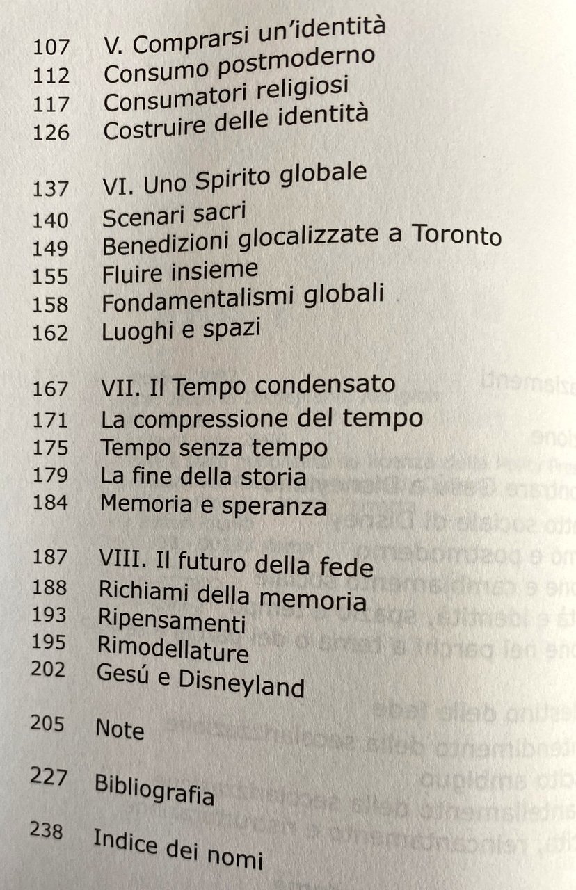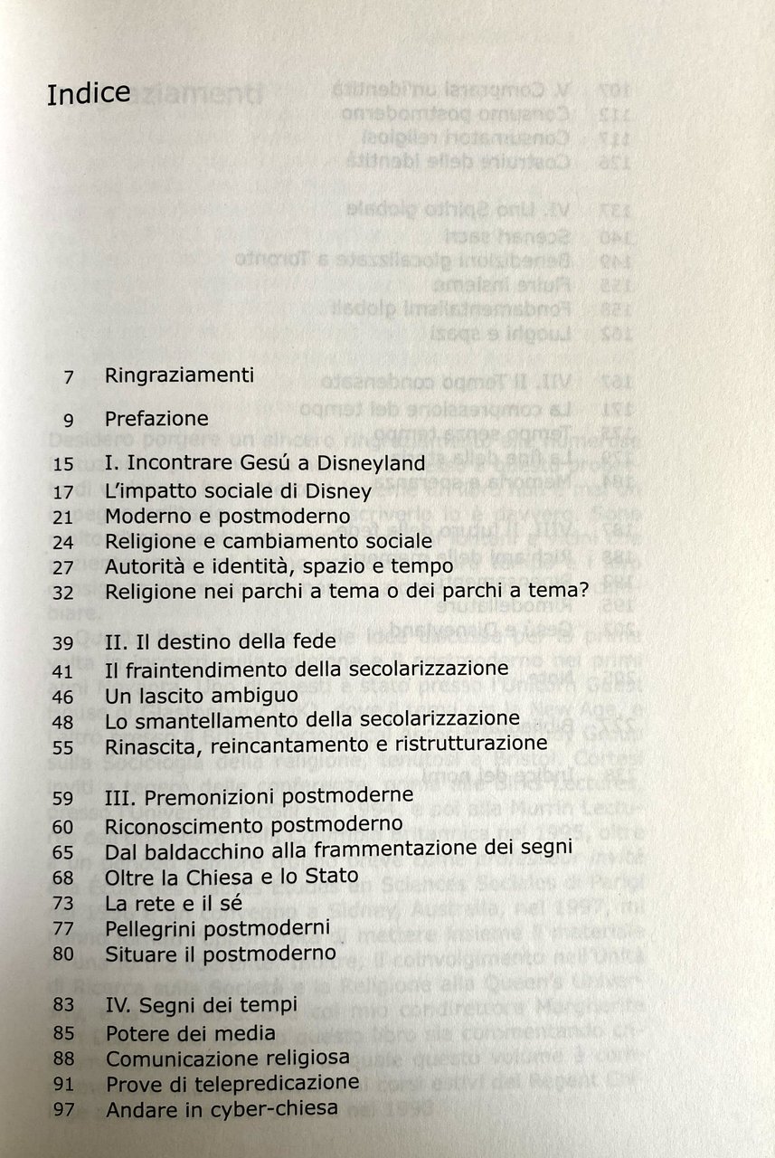 Soggetti: Sociologia Società Religione Attualità Saggistica Filosofia Impatto sociale Disney Postmodernità Autorità Identità Spazio Parchi a tema Fede Sacralità Secolarizzazione Premonizioni Frammentazione Segni Chiesa Stato Pellegrini Mass Media Comunicazione religiosa Telepredicazione Cyber-chiesa Storia Memoria collettiva Speranza TCI Religiosità Scienze sociali Fondamentalismo Globalità Globalizzazione Capitalismo Consumatori Consumismo Acquisti Divertimentificio Spettacolarizzazione Livellamento Esperienza Acquisto Zygmunt Bauman James Beckford Anthony Giddens Danièle Hervieu-Léger George Rawlyk Robert Wuthnow Spiritualità Cultura Tecnologia Fedeli Informazione Relativismo Postmodernismo Produzione culturale Serialità Divertimento Intrattenimento Tempo libero Sorveglianza Tecnologie Controllo Iconografia The Steeple's Shadow Myths and Realities of Secularization Cristianità Cristianesimo Cristiani Ambiguità Americani Aspetto Credenza Berger Bocock Bryan Wilson Burocrazia Clero Impegno Protestanti Contesto contemporaneo Convenzionale Controcultura Analisi David Martin Dominante Durkheim Etica Evangelici Femminismo Francis Schaeffer Ideologia Idolatria Industriale Joseph Weizenbaum Legittimazione Max Weber Medievalismo Miti Politica Sfera privata Protestantesimo Movimenti religiosi Rituali Musica rock Temi sacri Scientismo Secolare Studi Sessualità Steve Bruce Simboli Thomas Luckmann Tradizionale Laico Vittoriano Destino Shopping Nonluoghi Aeroporto Credenze Bibby Blackwell UK Canada Consumo Cyberspazio Deregulation Disneyficazione Disneyizzazione Fenn Flussi Focus Fukuyama Fondamentalismi Futuro Immagini Internet Islam Jean Baudrillard Liturgia Manuel Castells Mike Featherstone Nancy Ammerman Network Offerta Pentecostalismo Peter Beyer Polity Press Promise Keepers Teoria della scelta razionale Relazioni Attività Gruppi Organizzazioni Routledge Paesaggio Sage Compass Toronto Turismo Benedizione Tendenze Libri fuori catalogo Metanarrazione Bibliografia Riferimento Alain Touraine Blade Runner Corpo Turner Cyborg Harvey Derrida Foucault Gianni Vattimo Habermas Haraway Heidegger Iperreale Lavoro Lyotard Marx Marxismo Nietzsche Nichilismo Panopticon Progresso Richard Rorty Scott Lash Spostamenti Simmel Ulrich Beck McLuhan California Predicatori Vangelo Bibbia Magic Kingdom Butlin Spring Harvest Vacanze Pacchetti turistici Turisti Pellegrinaggio Legoland Eventi Logosland Merchandising Prodotti Gadget Showcase Déracinement Sradicamento John Arnott Vineyard Fellowship Fratellanza Marketing Sherry Turkle Lorne Dawson Teilhard de Chardin Flanagan Nothing Sacred Laicizzazione Compostela Karel Dobbelaere Henri Maier Europa Ebraismo Ortodossia Radicalismo Sikh Lourdes Medjugorje Fatima Turisticizzazione Purna Kumbh Mela Mecca Voyeurismo Guarigioni Predicazione Loreto Terra Santa Sociology Society Religion Current affairs Non-fiction Philosophy Impact Postmodernity Authority Identity Space Theme parks Faith Sacredness Premonitions Fragmentation Signs Church State Pilgrims Religious communication Tele-preaching History Collective memory Hope Religiosity Social sciences Fundamentalism Globality Globalization Capitalism Consumers Consumerism Shopping Spectacularization Leveling Experience Spirituality Culture Technology Believers Information Relativism Cultural production Seriality Fun Entertainment Free time Surveillance Technologies Control Iconography Christianity Christians Ambiguity Americans Appearance Belief Bureaucracy Clergy Commitment Protestants Contemporary context Conventional Counterculture Dominant analysis Ethics Evangelicals Feminism Ideology Idolatry Legitimation Myths Politics Private sphere Protestantism Movements Rituals Sacred themes Scientism Studies Sexuality Symbols Traditional Destiny Non-places Airport Beliefs Consumption Cyberspace Disneyfication Disneyization Flows Fundamentalisms Future Images Liturgy Offering Pentecostalism Rational choice theory Relationships Activities Groups Organizations Landscape Tourism Blessing Trends Out of print books Meta-narrative Bibliography Reference Nihilism Progress Displacements Preachers Gospel Bible Vacations Tourist packages Tourists Pilgrimage Events Products Uprooting Brotherhood Europe Judaism Orthodoxy Radicalism Touristization Healings Preaching Holy Land