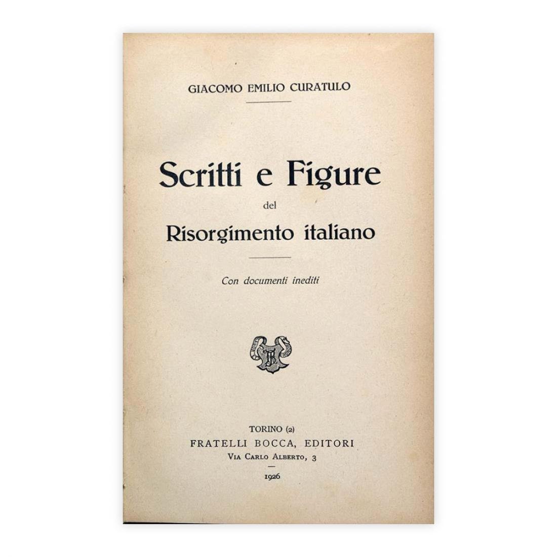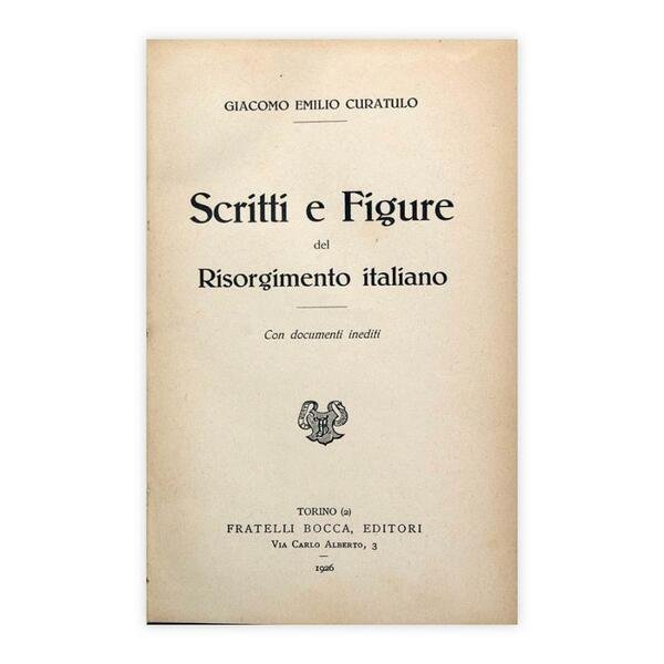 Autore: Giacomo Emilio Curatulo Titolo: Scritti e Figure del Risorgimento italiano Sottotitolo: Con documenti inediti Edizione: Fratelli Bocca Editori - Torino 1926 Dimensioni: 12,5 x 20 cm c.a. Pagine: 316 Copertina: Cartonato Condizioni: Ottime come da foto