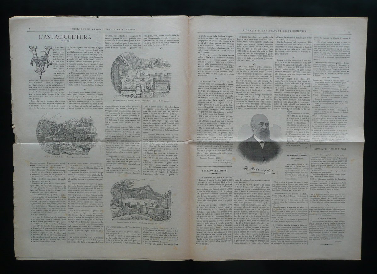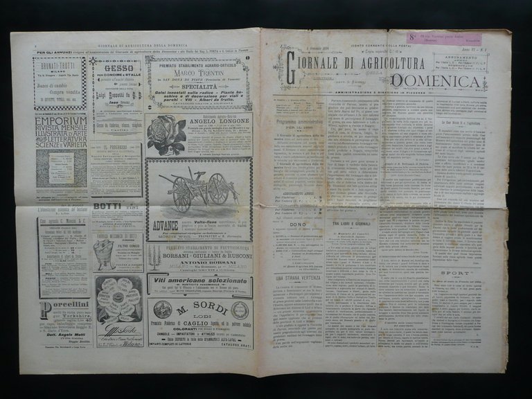 Settimanale, L'Astacicultura" in "Giornale di Agricoltura della Domenica" Anno VI - Numero 1 Piacenza, 5 Gennaio 1896 Tip. Marchesotti e Porta, Piacenza 1896, cm 44,5x31, pp. 8 con qualche fig. in b/n n. t.; esemplare a fogli sciolti. Numero completo. Margine sup. della prima pagina con applicata una vecchia etichetta per spedizione postale e con un'annotazione d'epoca a mano. Condizioni di conservazione Esemplare in buone condizioni con normali pieghe di conservazione, alcune leggere bruniture, margini est. e sup. con piccoli strappetti e difetti. Pagine intonse. Presenza di un articolo di poco pi√π di una pagina intitolato "L'Astacicultura", corredato da tre illustrazioni in bianco e nero nel testo. Articolo firmato da D. Levi-Morens. Numero completo. Pagine intonse. SC03.D10167 N "