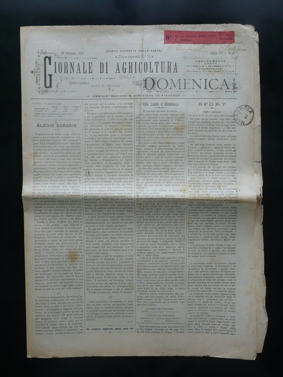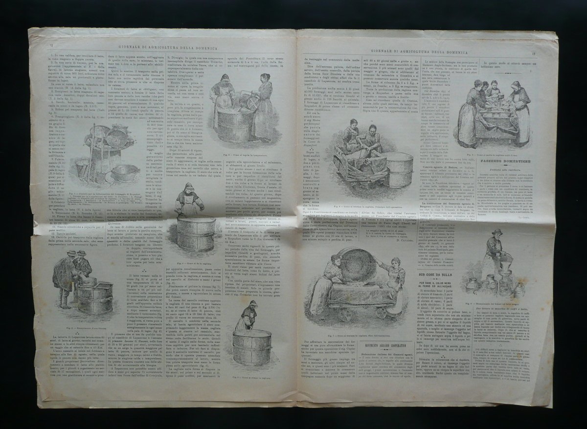 Settimanale, Il Formaggio di Rocquefort" in "Giornale di Agricoltura della Domenica" Anno VII - Numero 2 Piacenza, 10 Gennaio 1897 Tip. Marchesotti e Porta, Piacenza 1897, cm 44,5x31, da pagina 9 a pagina 16 (esemplare autonomo con numerazione progressiva) con 9 fig. in b/n n. t.; esemplare a fogli sciolti. Numero completo. Margine sup. della prima pagina con applicata una vecchia etichetta per spedizione postale e con un'annotazione d'epoca a mano. Presente anche il timbretto di spedizione postale. Condizioni di conservazione Esemplare complessivamente in buone condizioni con tracce d'uso, normali pieghe di conservazione, alcune lievi bruniture, margini est. e angoli con alcuni strappetti, qualche piccola pieghetta e traccia di piega. Presenza di un articolo di poco pi√π di due pagine intitolato "Il formaggio di Rocquefort", corredato da 9 illustrazioni in bianco e nero nel testo. Articolo firmato da D. Cavazza. Numero completo. SC03.D10163 N "