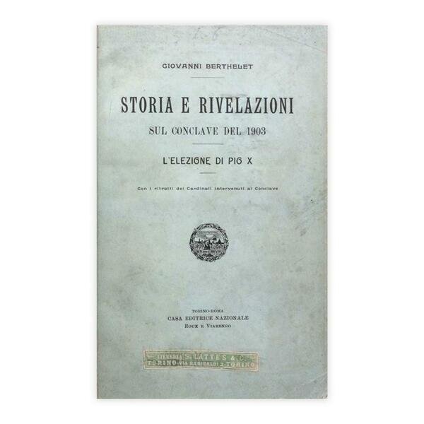 Autore: Giovanni Berthelet Titolo: Storia e rivelazioni sul Conclave del 1903 Sottotitolo: L'elezione di Pio X - Con i ritratti dei Cardinali intervenuti al Conclave Edizione: Torino-Roma Casa Editrice Nazionale Roux e Viarengo 1904 Dimensioni: 15 x 23 cm c.a. Pagine: 301 Copertina: Cartonato Condizioni: Ottime come da foto