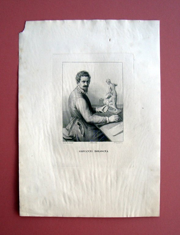 Incisione su rame d'epoca 1842 , Giovanni Bologna Da un dipinto di Scuola Fiorentina incisore P. Trasmondi tratto da Galleria Pitti illustrata per cura di Luigi Bardi Firenze coi Tipi della Galileana 1842 Incisione a bulino (su rame), Tipi della Galileiana Firenze 1842 , cm 44x31,5 misura del foglio Condizioni di conservazione. Esemplare in buono stato di conservazione, qualche leggera ondulazione; mancanza angolo sup.(vedi foto) Incisione d'epoca originale (1842) INC.0101 blu