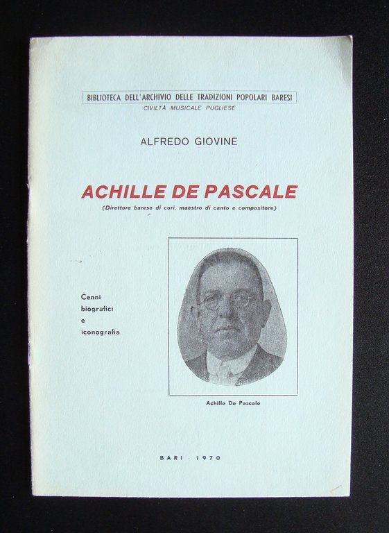 Alfredo Giovine, Achille De Pascali (Direttore barese di cori, maestro di canto e composizione) Cenni biografici e iconofrafia Biblioteca dell'Archivio delle Tradizioni Popolari, Bari, 1970, cm 24x17, pag.8, cart.ed.con ill fot.b/n.edizione curata. Condizioni di conservazione: Esemplare in buono stato con leggere tracce d'uso e del tempo, br.con qualche leggera brunitura ai margini; interni perfetti.TimbroOmaggio all'antiporta. OPEB.3357 BLU