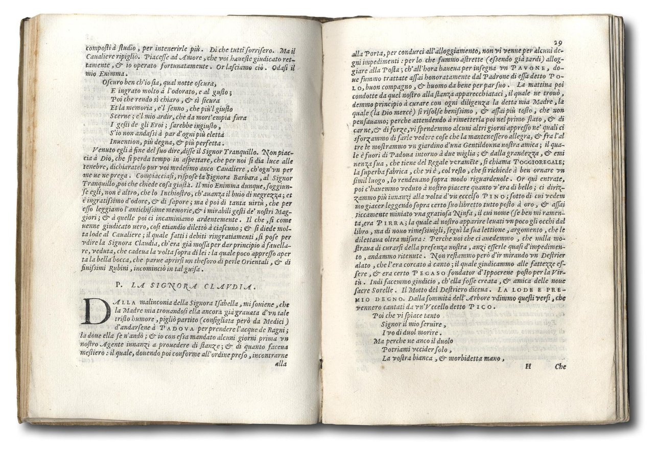 >in-4, ff. (4), 51, (1 finale, con errata), carattere corsivo. Legatura coeva in pergamena floscia, assai fresca. Bella impresa dello stampatore al titolo, testatine ed iniziali istoriate. Edizione originale di curioso ''divertissement'' letterario, che descrive il ''gioco dell'ABC''. Impressione mantovana di rara eleganza grafica. Precede il testo la dedica a Vincenzo Gonzaga e avviso ai lettori. A. Mori (1533-1591), gentiluomo mantovano alla corte dei Gonzaga, ricoprì cariche militari e fu membro dell'Accademia degli Invaghiti. Il "giuoco" narra gli intrattenimenti offerti nel castello di Barbara Calina durante il Carnevale di Brescia del 1566. Ogni commensale è invitato a raccontare una storia in prosa e versi traendo spunto da una lettera dell'alfabeto (il nome della città, dei personaggi e di altri elementi della narrazione dovranno ispirarsi alla lettera prescelta). Barbara Calina, musa dell'Accademia degli Occulti, fu figura di spicco della vita letteraria ed artistica bresciana; le furono dedicate due raccolte madrigalesche di Giovanni Contino e, secondo de' Mori, avrebbe ricevuto l'omaggio di un dipinto del Tiziano, oggi perduto, raffigurante Frisso ed Elle. Ottimo esemplare, di illustre provenienza: Martini e Iacobj Manzoni. STC 449. Bologna, Trivulziana 226 (Rime sole). Adams M-1783; Olschki Choix II, 2610. Cfr. Bizzarini, Gentildonne bresciane e mecenatismo musicale nel Cinquecento.