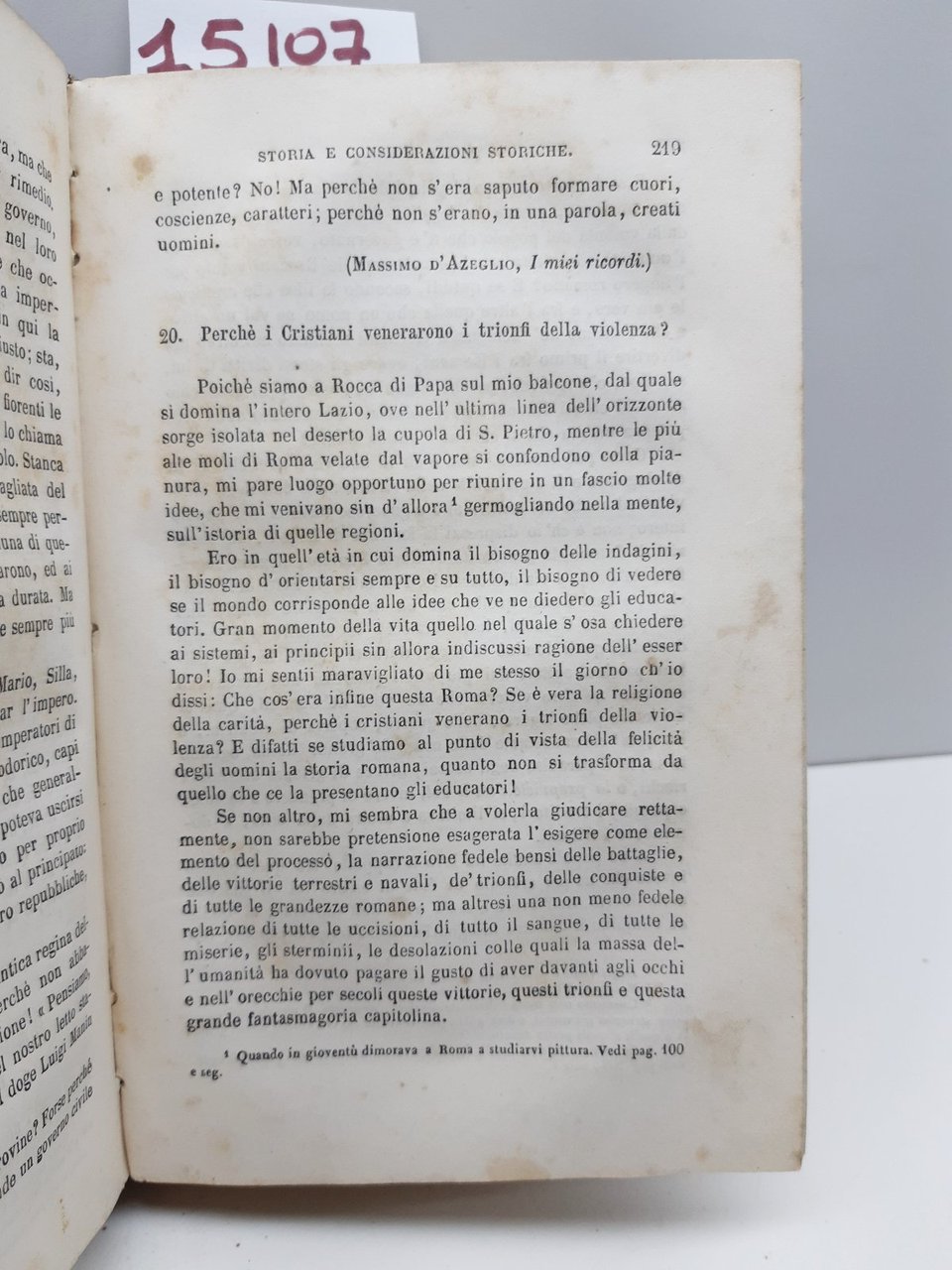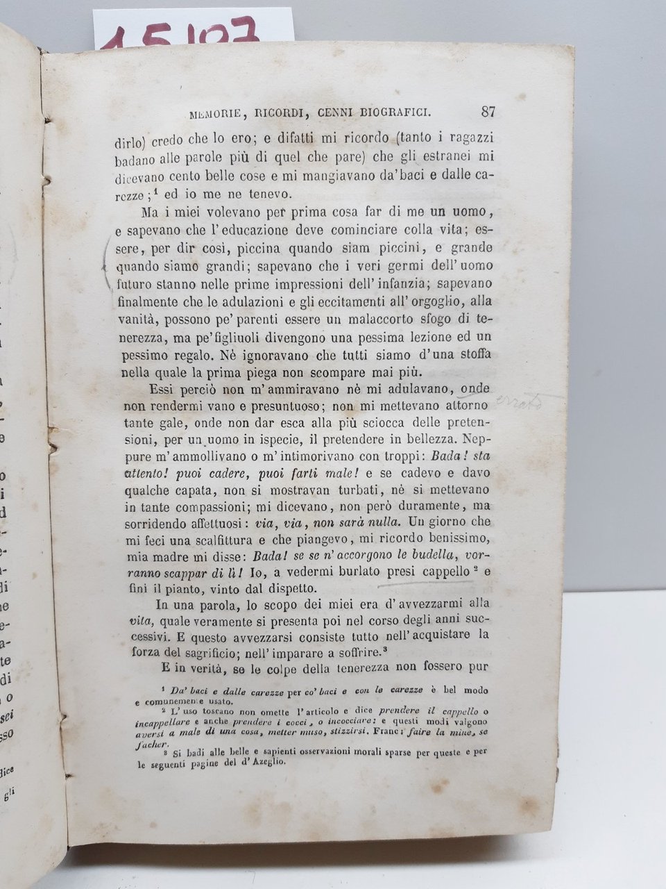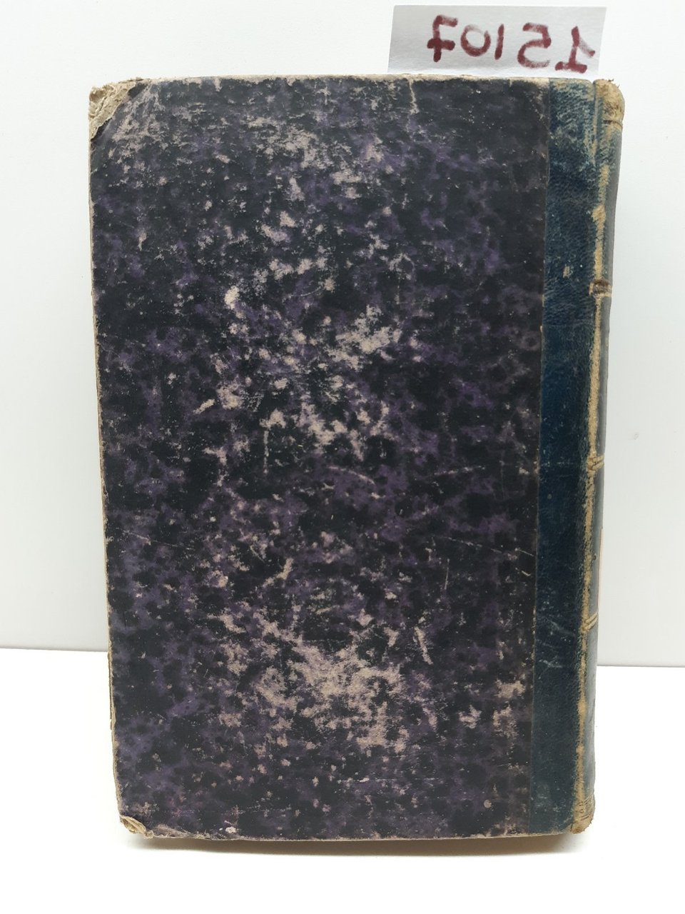 Legatura in mezza pelle in condizioni accettabili, piatti marmorizzati con alcune mancanze e abrasioni, dorso in pelle blu con titoli in oro, abrasioni ai margini dei piatti ed etichetta di catalogazione, tagli spruzzati impolverati quelli superiori, alla seconda di copertina ex-libris, firma di possesso alla prima pagina bianca e all'antiporta, antiporta con disegno colorato, frontespizio con restauro al margine superiore ed inferiore interno, alcune tracce di colore derivanti dal disegno della antiporta, interno in discrete condizioni, fioriture alle pagine interne che non vanno a disturbare la lettura, sottolineature e appunti ai margini del testo, numero pagine 520 dimensioni cm 18,5 X 12,5