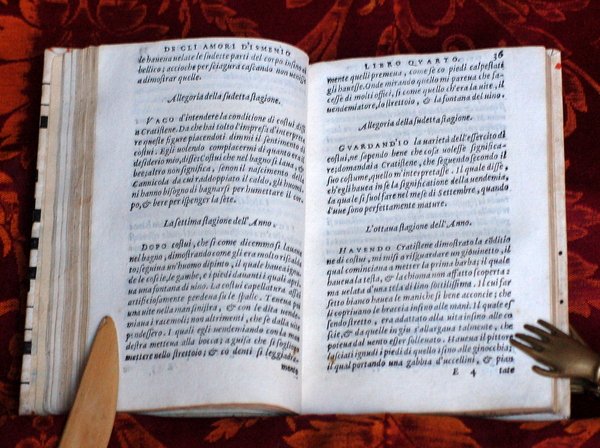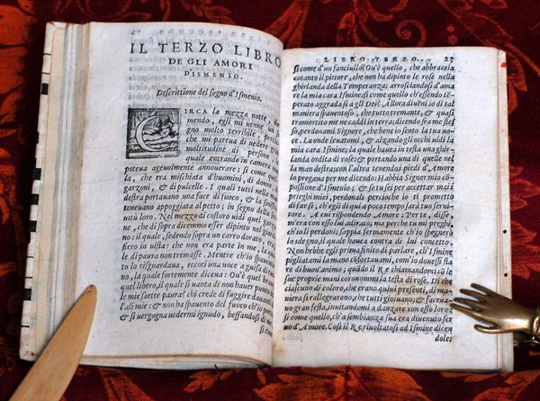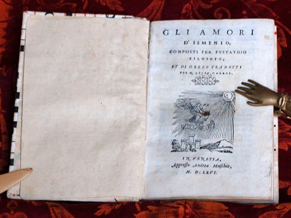 [Erotica] (cm.15) buona mz. pergamena antica ben restaurata, piatti con musica a stampa, sguardie antiche.-- cc. 100, elegante corsivo, capolettera ornati e figurati. dedica del traduttore al signor marchese di polignano datata XXI Agosto 1550. Edizione non comune, manca a Bm. Stc. ed Adams, nonchË a Razzolini e a Poggiali. Apparso nel 1550 per il Torrentino, porta la stessa dedica del Carani, ma con data diversa.L' autore visse nel XII secolo, fu Arcivescovo di Tessalonica, svolse un' intensa attivit‡ letteraria, nonostante il suo impegno di rialzare la disciplina e lo spirito del monacato contrastato dalla resistenza dei monaci stessi. Ebbe successo e pi˘ edizioni, una del 1801 sta nella " Raccolta degli Erotici Greci Tradotti in Italiano ". Margine alto sobrio che a volte intacca la numerazione ma bell' esemplare molto nitido e fresco con alcune postille coeve ai margini bianchi. * Gamba 1388 in nota; * Hoffman II 116; * Haym "Libri Rari " 395/6; * Paitoni II 61; * Argelati II 67: " La Stampa Ë assai bella "; * Gay I 103 cita solo l' edizione del Torrentino.[f52]