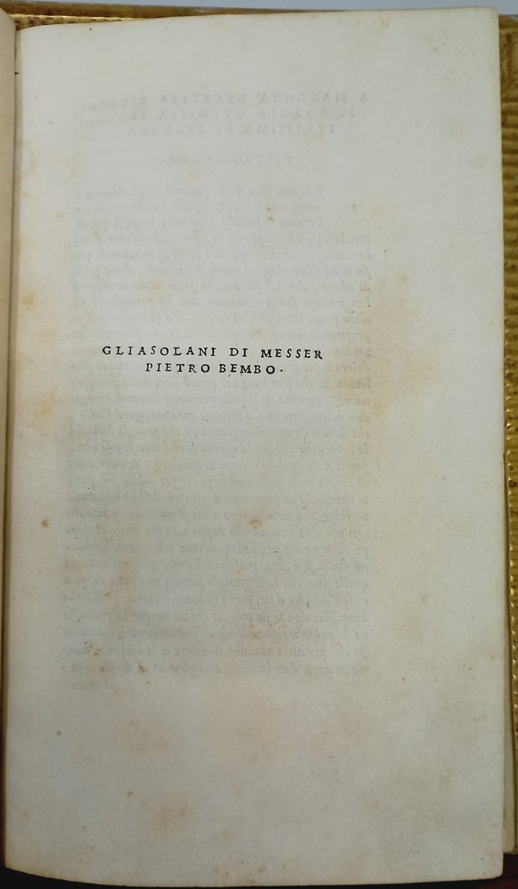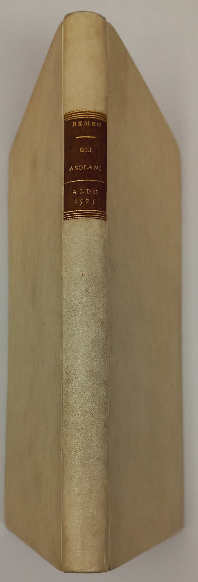 >in-4 picc. (mm 211x125), ff. 98 n.n. (segn. a-m8, n2, manca ultimo bianco), al verso del titolo vi è la dedica che prosegue al recto del secondo f., seguono 94 ff. di testo e 1 di Errata. Carattere corsivo; ancora aldina al verso dell'ultimo foglio di testo. Elegante legatura recente in pergamena rigida, titolo in oro al dorso su tassello. Prima edizione del noto romanzo del Bembo, ambientato ad Asolo ove alla corte di Caterina Cornaro regina di Cipro si festeggia lo sposalizio di una dama: in tre giornate alcuni gentiluomini veneziani parlano con delicatezza e vivacità di amore con altrettante gentildonne. Il Bembo iniziò a comporre Gli Asolani nel 1500, per amore di Maria Savorgnan, ma li concluse nel 1504, con una dedica, datata 1 Agosto, a Lucrezia Borgia, (''corrisposto, il più ambizioso e memorabile, ma rischioso anche e struggente amore della sua vita'' lo definì il Dionisotti). Questo bell'esemplare, completo dell'Errata spesso mancante, comprende, al verso del tit. ed al recto del secondo foglio, la lettera a Lucrezia. ''Non è chiaro perché di questa edizione si abbiano esemplari contenenti la dedicatoria a Lucrezia, nel frattempo diventata duchessa di Ferrara, e altri senza; ma è probabile che la duplicità non fosse estranea alle incertezze e difficoltà di un amore impossibile, che nella lontananza, da una parte e dall'altra, lentamente ma inevitabilmente si spegneva'' (ancora Dionisotti). Il Renouard attribuisce invece a ragioni politiche questo ripensamento, sottolineando che quasi sempre il f. bianco veniva tagliato, così come l'errata. Cecil H.Clough, in ''P.Bembo's Gli Asolani of 1505'' ritiene che la dedica sia stata deliberatamente antedatata, e che fosse in realtà stata scritta poco prima del Marzo 1505: Aldo avrebbe riservato 3 pagine bianche in attesa dell'approvazione di Lucrezia, stampando comunque alcune copie del quaderno a; non volendo rischiare di ripassarle al torchio, licenziò circa un terzo degli esemplari con le pag. bianche (cfr. Fletcher, New Aldine Studies, p. 185: ''Clough contends that the dedicatory was deliberately antedated by Bembo... that Aldus held three pages blank... that Aldus dared not risk spoiling the quantity of sheets already printed by putting them through the press once more to add the letter, and thus issued a quantity (one third of the pressrun?) with the blanks''). Bellissimo esemplare assai marginoso, (ininfluente macchia di ruggine al f. m3). Renouard 48.1: ''Première édition assez rare''. Ucla 72. Scapecchi, A.M., i suoi libri, i suoi amici, n. 33. Laurenziana 90. Gamba 132. Shirley Smith, The Prettiest Love Letters in the World... Lucrezia Borgia & Pietro Bembo,1987.