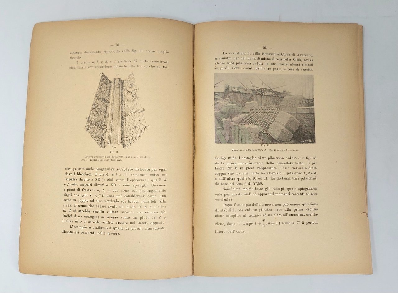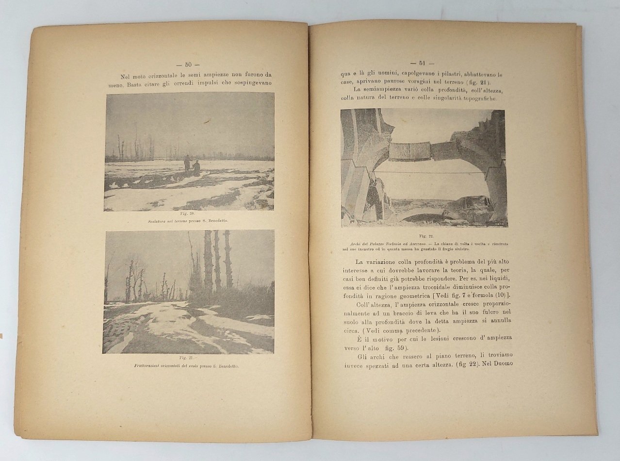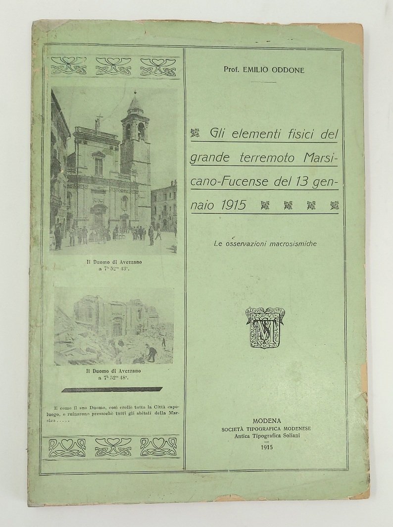 >In-8 pp. 152 con 60 illustrazioni nel testo: disegni e fotografie che documentano i danni del terremoto, brochure editoriale illustrata (dorso riparato). Estratto dal Bollettino della Società Sismologica Italiana, Vol. XIX fasc. 8-4, anno 1915. Buon esemplare, uniformemente brunito, nella sua brossura originale, con minime mancanze.