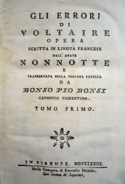 Gli errori di Voltaire. Opera scritta in lingua francese dall'abate Nonnotte e trasportata nella toscana favella da Bonso Pio Bonsi canonico fiorentino. Tomo primo [- secondo].