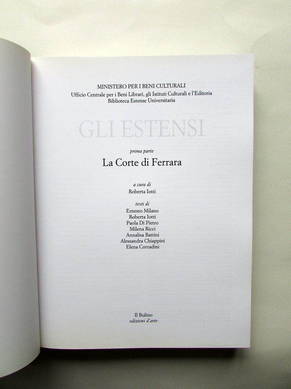 AA. VV., Gli Estensi prima parte la corte di Ferrara a cura di Roberta Iotti Il Bulino, Modena 1997; cm 31,5x23,5; pp. 400 con numerose ill. in b/n e a colori; tutto cartonato ed. telato con sovraccoperta ed. ill. a colori. Condizioni di conservazione Ottime condizioni con minime tracce d'uso. Interni ottimi, freschi. SETT64.LBIS26539 N