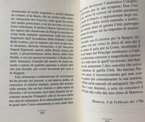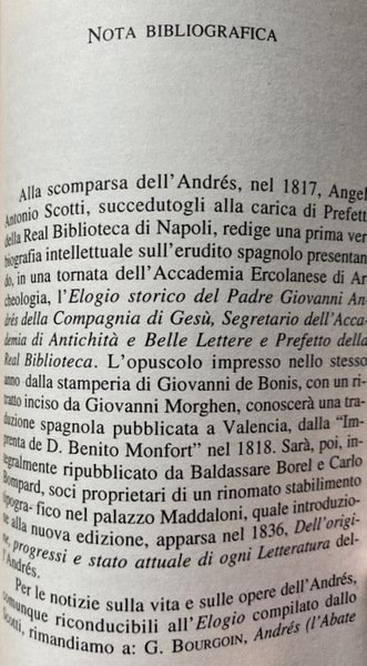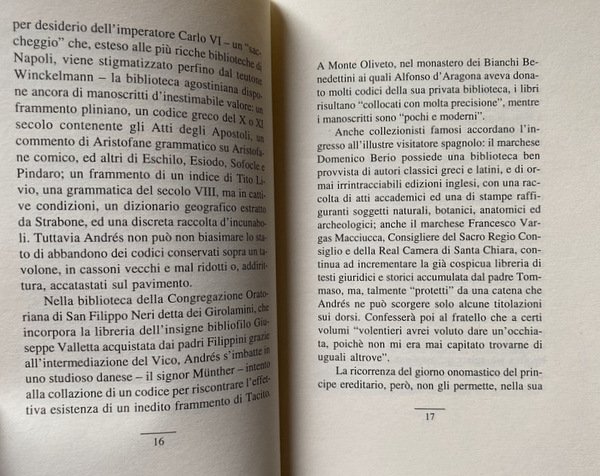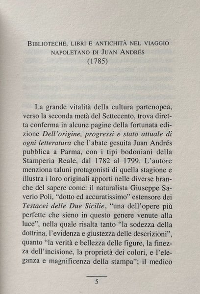 Soggetti: Reportage di Viaggio, Resoconti, Settecento, Intellettuali, Voyage, Descrizioni, Luoghi, Città, Napoli, Folklore, Viaggiatori, Grand Tour, Storia locale moderna, Erudizione, Aneddotica, Lettere familiari, Epistolario, Carteggio, Iconografia, Regno, Borboni, Pompei, Ercolano, Goethe, Abate spagnolo, Dell'origine, progressi e stato attuale di ogni letteratura, Cartas del abate D. Juan Andrés, Documenti, Umanisti spagnoli, La Biblioteca Real de Nápoles, Biblioteca reale, Pubblicazioni, Giuseppe Bonaparte, Corruzione, Spoglio bibliografico dei fondi, Restaurazione borbonica, Attività bibliografica, Bibliofilia, Bibliofili, Bibliografia, Studi culturali, Riferimento, Collezionismo, Biografie letterarie, Libri Vintage Fuori catalogo online, Walks, Paesaggio, Itinerari culturali, Guide, Cultura partenopea, Iconografia, Stamperia, Stampa, Editoria, Descripción de Nápoles, Pompeya y Herculano, Correspondencia, Saggistica, Opere generali, Gusto settecentesco, Gesuiti, Carlo III di Borbone, Illuminismo, Eclettismo, G. Tiraboschi, S. Bettinelli, G. R. Carli, Ducato di Parma, Galileo Galilei, Jesuítas, Madrid, Chiesa, Città, Collegio, Sicilia, Vitalità, Antichità, Rarità, Nicola Billi, Giovanni Morghen, Pittura, Incisioni, Antonio Genovesi, Gaetano Filangieri, Novello De Bonis, Ferrara, Mantova, Roma, Classicismo, Magna Grecia, Santa Chiara, Gesù Nuovo, Madonna del Parto, Mergellina, Posillipo, Chiese, Palazzi, Strade, Quartieri, Castel Nuovo, Raimondo di Sangro, Sansevero, Monte di Dio, Nunziatella, Catacombe, San Gennaro, Santa Teresa degli Scalzi, Girolamini, San Filippo Neri, Munther, Giuseppe Valletta, Monteoliveto, Aragona, Corona spagnola, Domenico Berio, Nobiltà, Aristocrazia napoletana, Macciucca, Pozzuoli, Lucrino, Campi Flegrei, Vesuvio, Bacoli, Cuma, Miseno, Templi, Serapide, Agrippina, Piscina mirabilis, Gino Doria, Palazzo Maddaloni, Centro storico, Decumani, Galiani, Napoles, Travel Reportage, Reports, Eighteenth Century, Intellectuals, Descriptions, Places, Cities, Naples, Travelers, Modern Local History, Erudition, Anecdotal, Family Letters, Correspondence, Iconography, Kingdom, Bourbons, Pompeii, Herculaneum, Spanish Abbot, Progresse and current status of each literature, Documents, Spanish Humanists, Royal Library, Publications, Corruption, Bibliographic counting of funds, Bourbon Restoration, Bibliographic activity, Bibliophilia, Bibliophiles, Bibliography, Cultural studies, Reference, Collectibles, Biographies Literary, Out of print books, Landscape, Cultural itineraries, Guides, Neapolitan culture, Iconography, Printing, Publishing, Non-fiction, General works, Eighteenth-century taste, Jesuits, Charles III of Bourbon, Enlightenment, Eclecticism, Duchy, Church, City, College, Sicily, Vitality, Antiquity, Rarity, Painting, Engravings, Mantua, Rome, Classicism, Churches, Palaces, Roads, Neighborhoods, Catacombs, Aragon, Spanish crown, Nobility, Neapolitan aristocracy, Vesuvius, Temples, Serapis, Agrippina, Centro historical